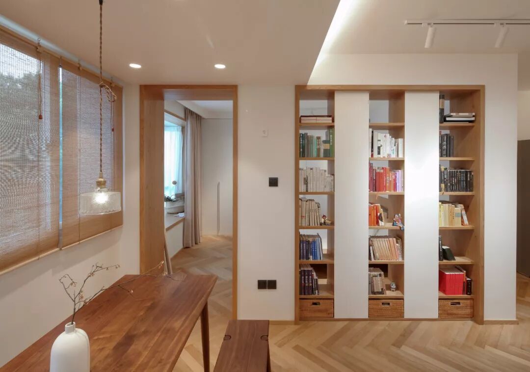 ▲与客厅之间的这面墙,都是半空的书架,让空间透而不空的感觉,很大方;