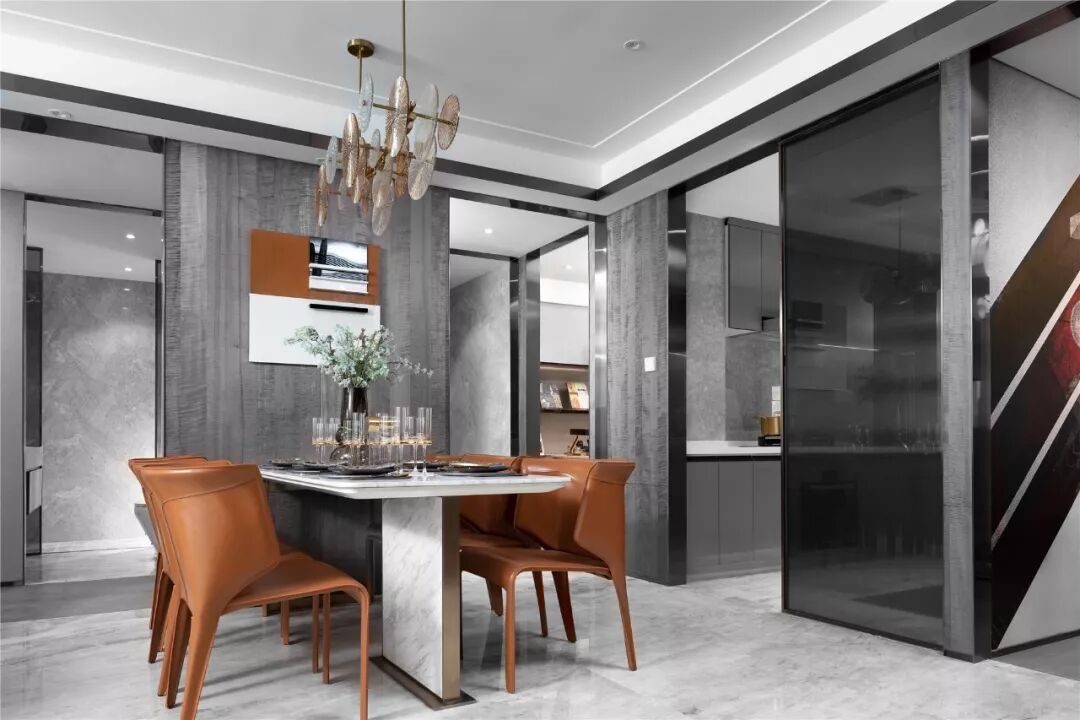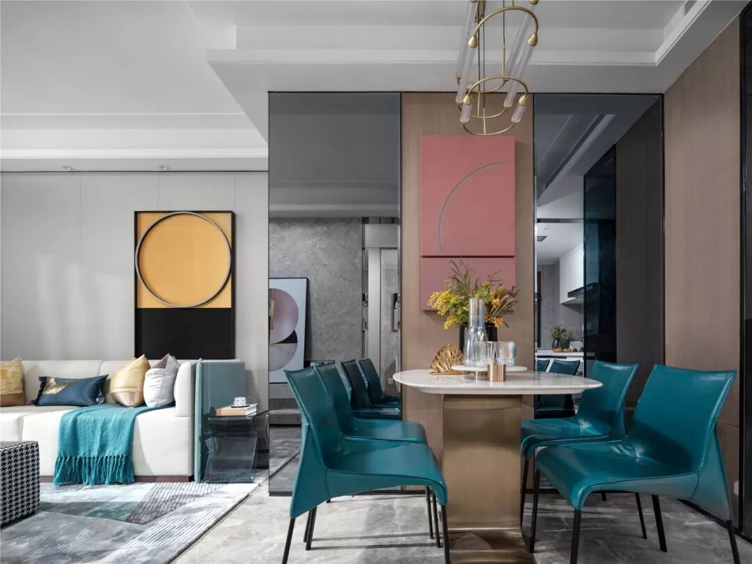 草在结它的种子,风在摇它的叶子。时光平平流动,不经意就摇落了盛夏的暑意,摇出了一把初秋的灿阳,Z后融成一汪深郁琥珀,流进了时光的罅隙。本案设计师在限定的空间形态中,以轻盈的黑白灰为底色,点薄荷蓝绿、缀琥珀色等跳色,搭配大理石、金属、琉璃、布艺等多样材质,梳理出宁静欢愉的生活氛围。