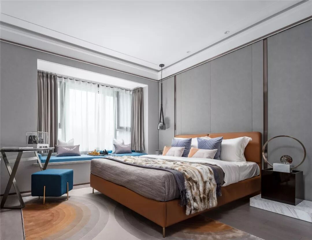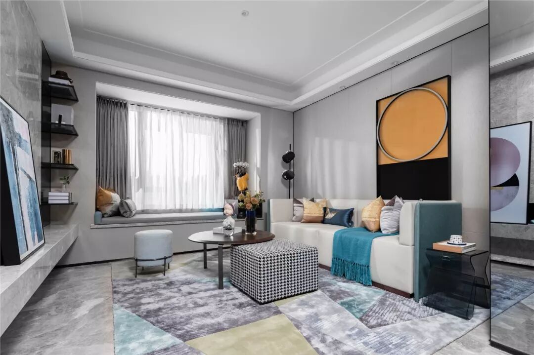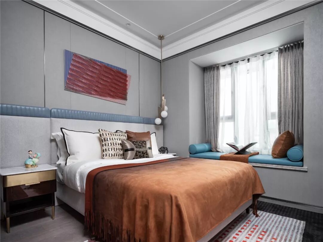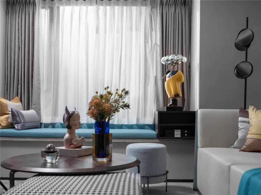 灰色和琥珀色温柔交织,宁静舒暖;飘窗下薄荷蓝绿悬浮,清爽宜人。各式的圆串联其中,碰撞着方正的形制,稳重而不失灵动。