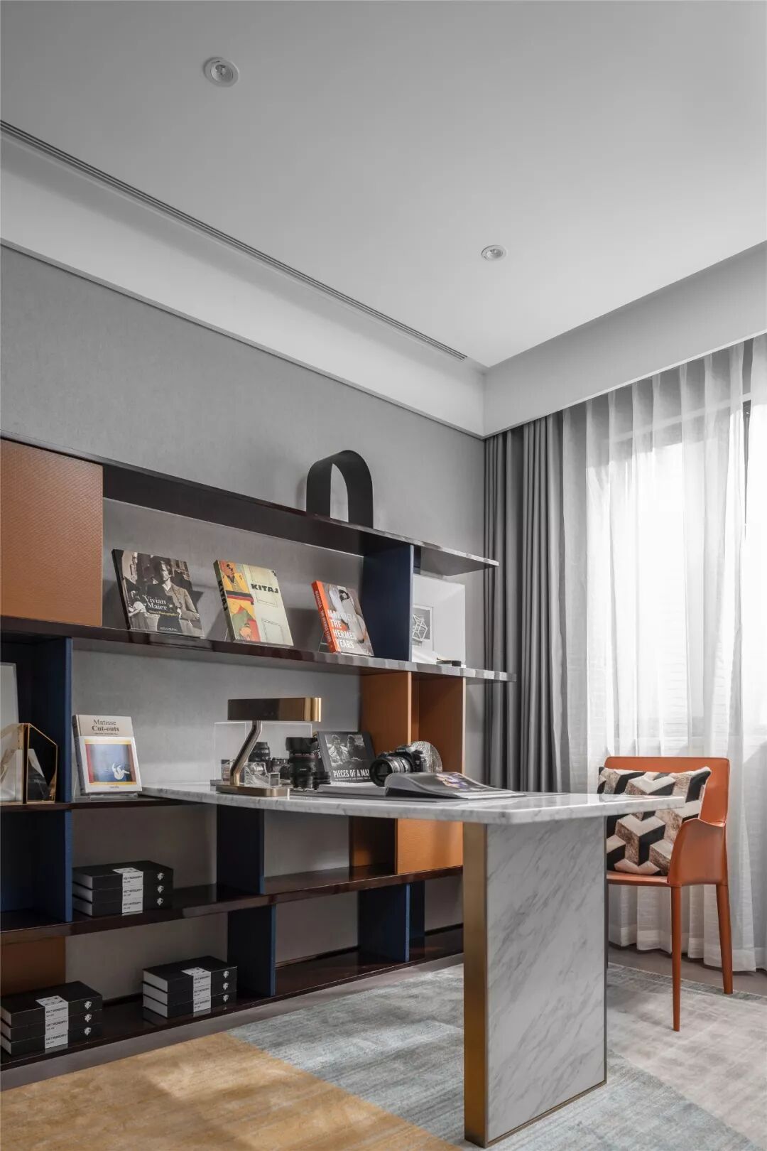 读书处玻璃通透,光线朗然。灵活组合的书桌书架浑然一体,暗喻书中外延的精神世界。琥珀色、黑色、灰色几大色块迭拼搭配,碰撞出妥帖的趣味。