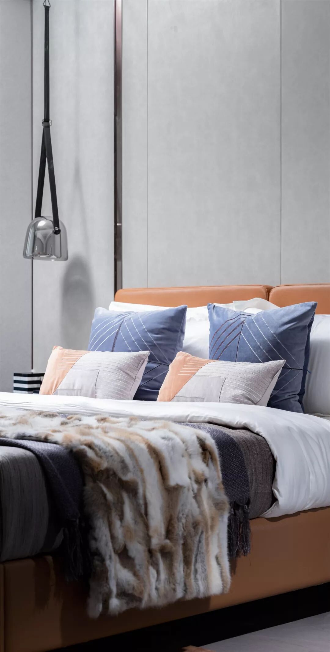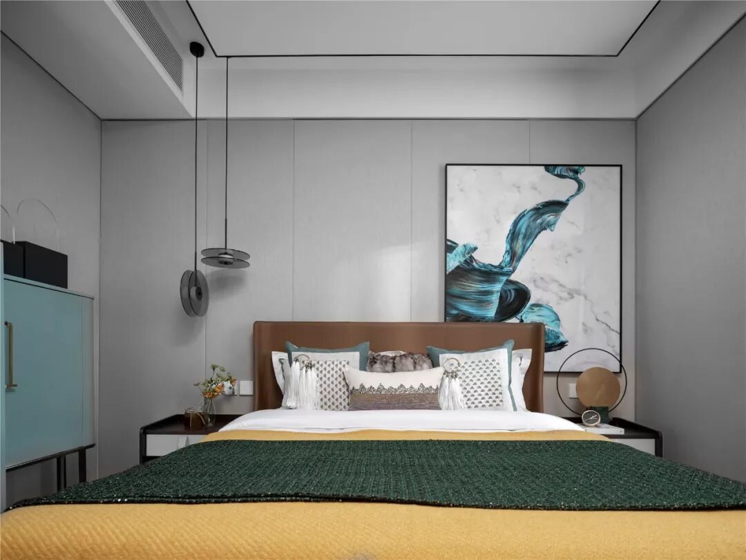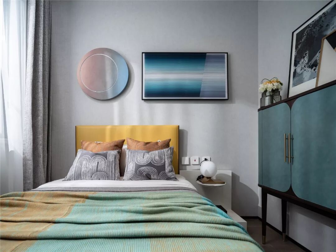 次卧空间,延续空间的整体基调与精髓,演绎清隽而优雅的日常。清爽宜人的蓝绿色点缀增添清新感,呈现出舒适静谧的睡眠氛围。清晨的一米阳光透过玻璃窗,暖意满溢全身。