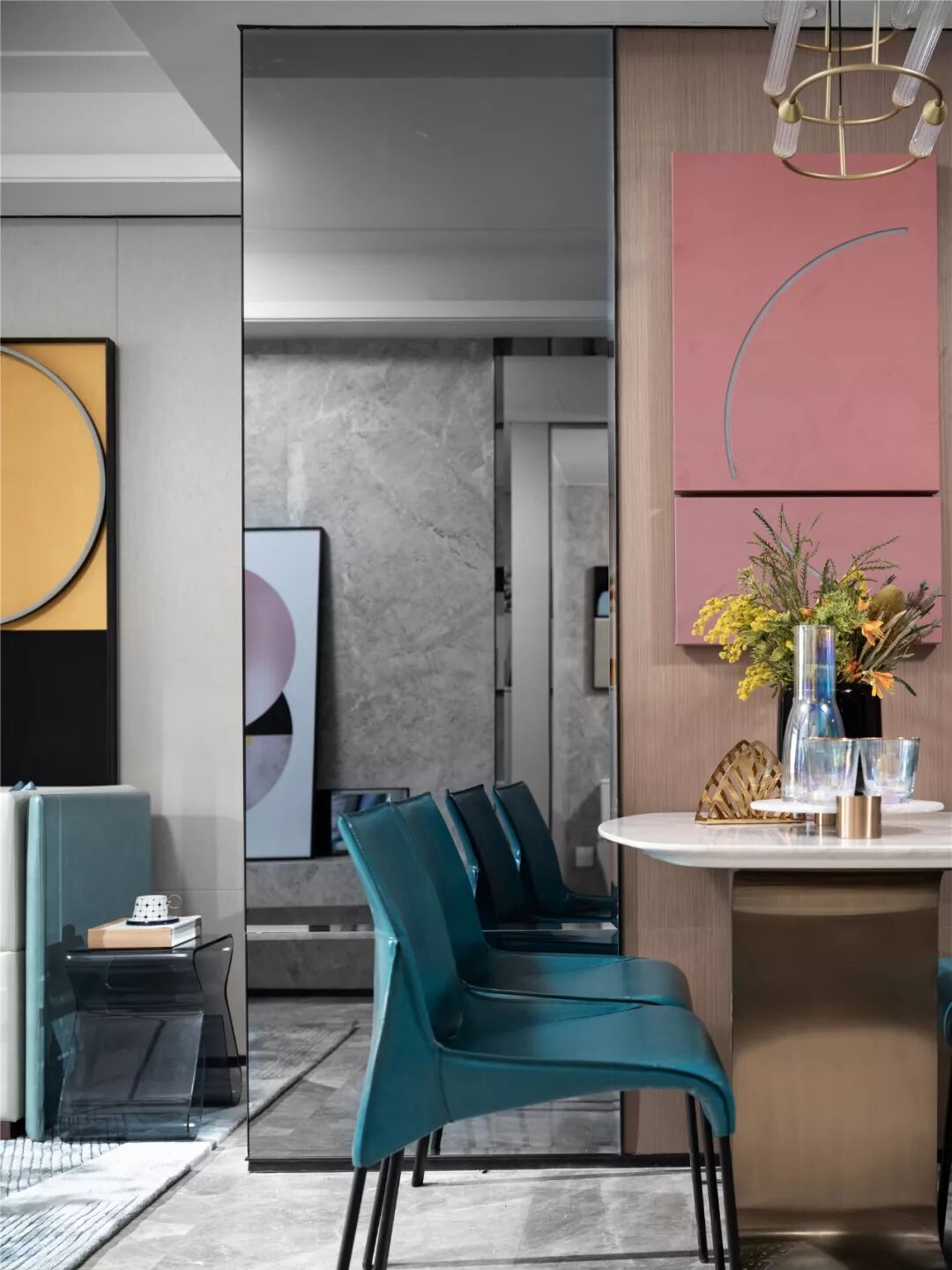 色调上将薄荷蓝绿、琥珀色和黑白灰色搭配,室内空间呈现宁静之感,灰色家具调和过渡色彩,起到缓和作用。空间作为生活的承载体,设计师从生活无数个生动的小片段中,描摹心之所向,融汇构筑生活、艺术的美感与期许。