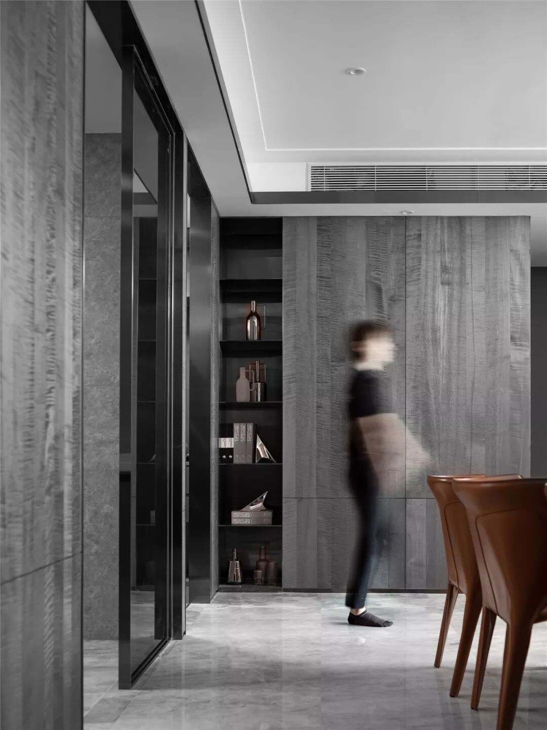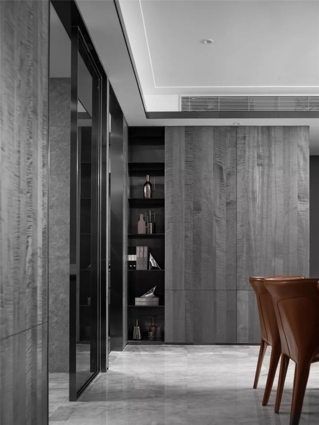 大面积高级灰木饰面使空间沉稳而大气,虽然只是简单的面的形式,但是勾勒出的绝不单单是一个外在。取酒小酌、抽书慢阅,足以细味人间书里的故事百态。