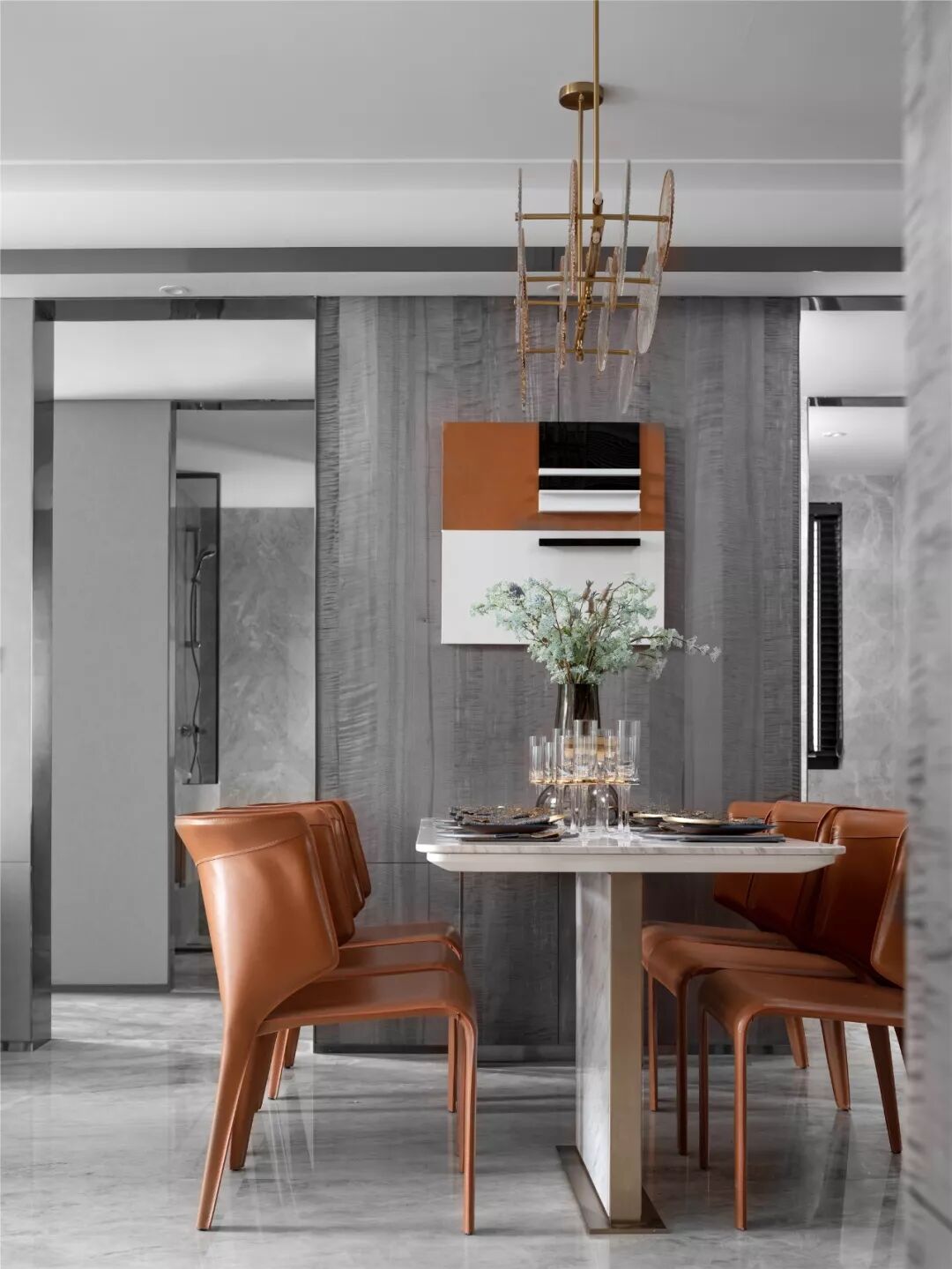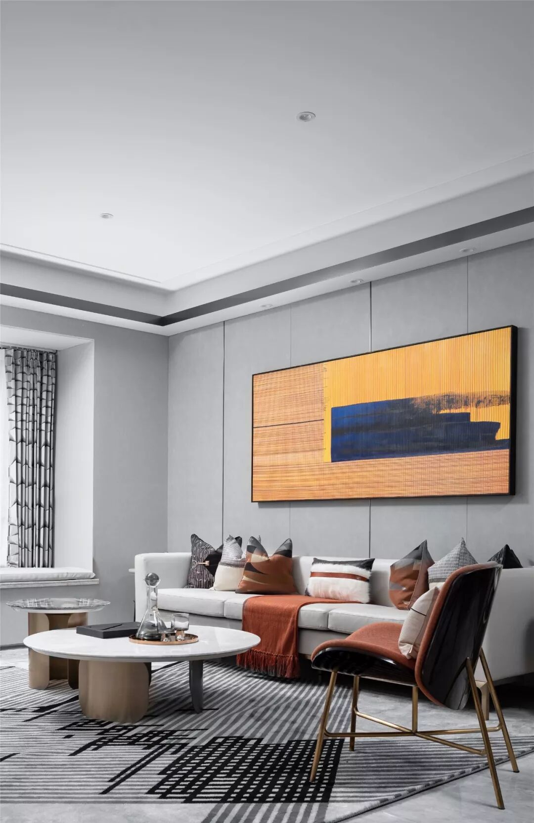 客厅以灰色让整个空间显得沉稳,宁静,彰显奢华气度。不同浓度、材质铺垫其中,搭配各式摆件,组合出细腻的质感层次。琥珀色走笔挂画,糅着深蓝形成鲜明的视觉焦点。