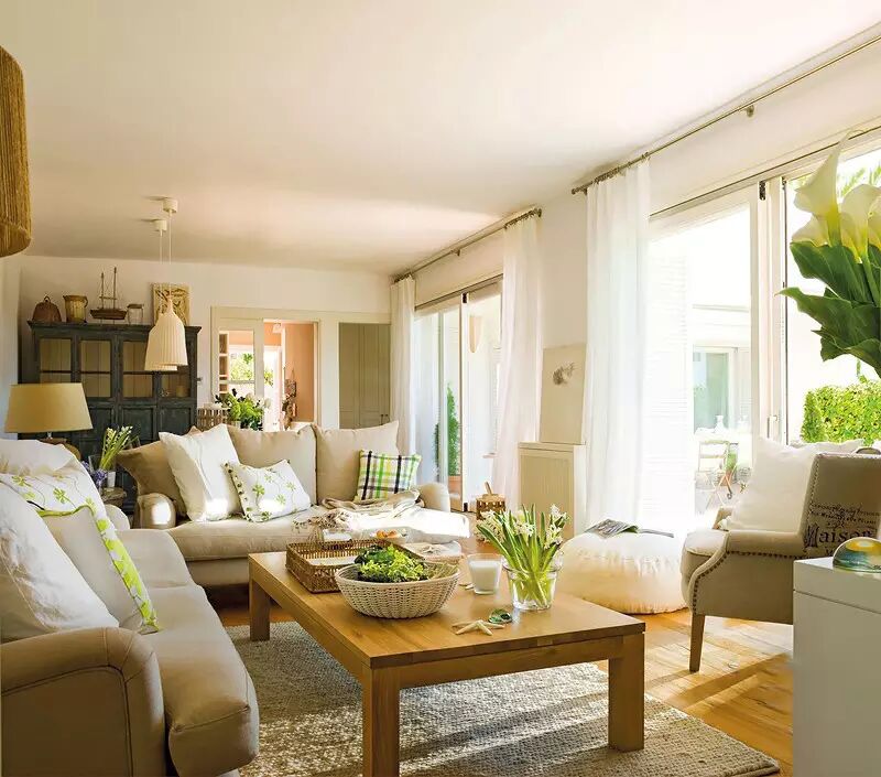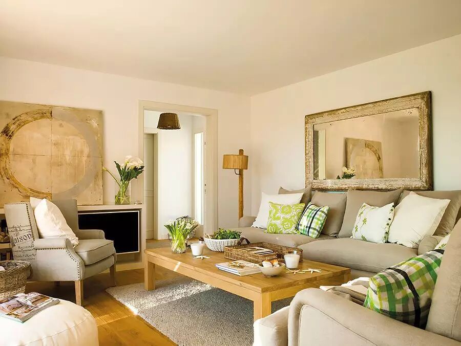 客厅以布艺沙发搭配简约的原木质感,整体氛围很轻松年轻的感觉;