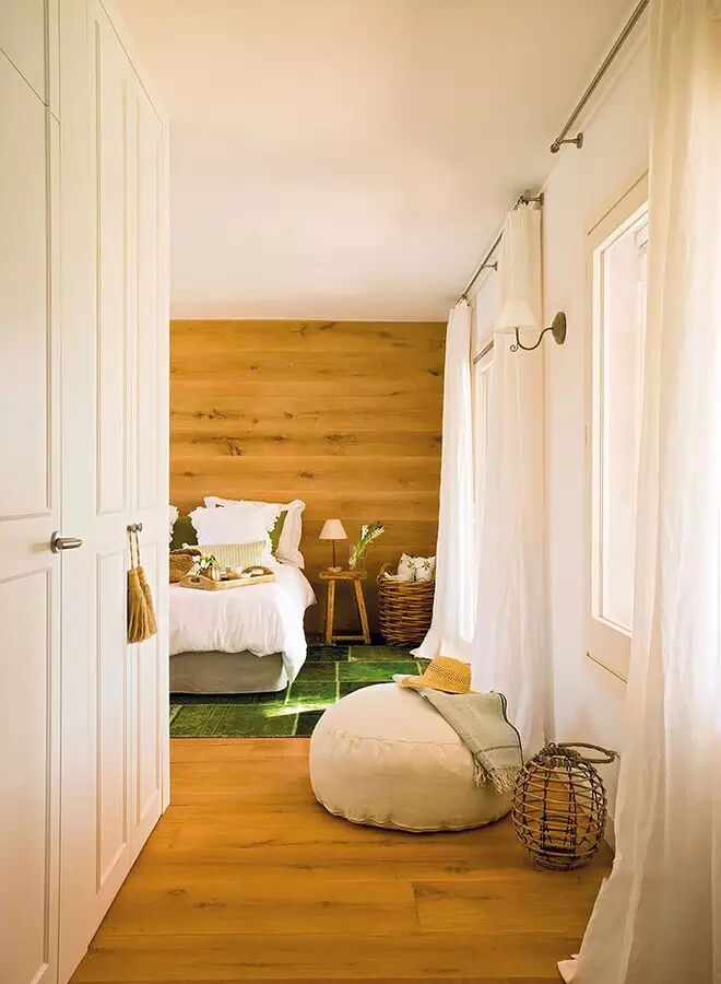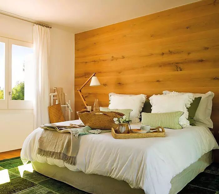 卧室床头以木质感打造,搭配清新的床被,整体给人以清新舒适的氛围;
