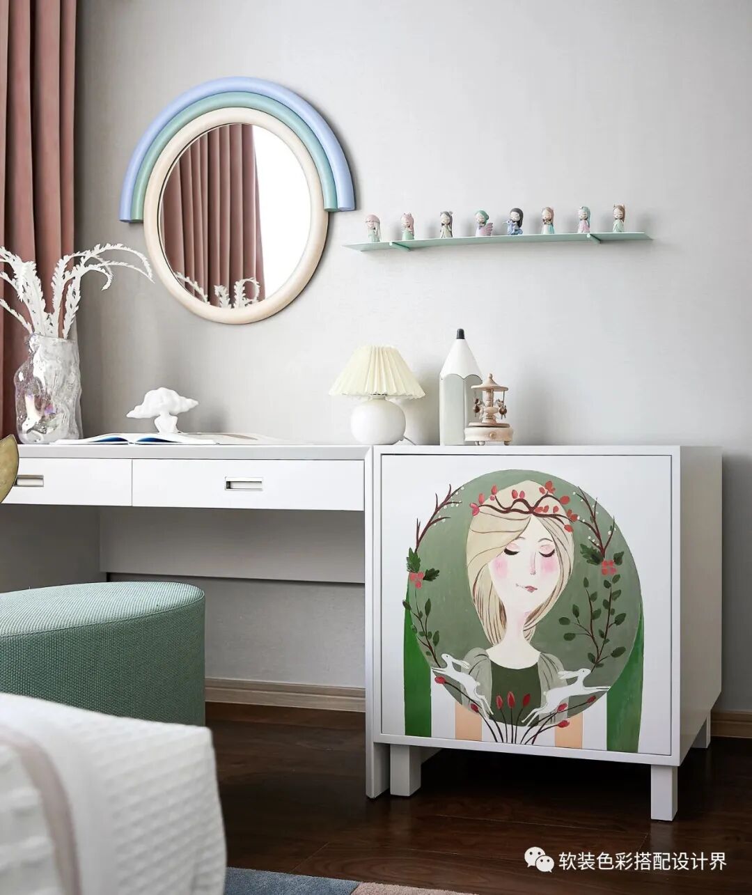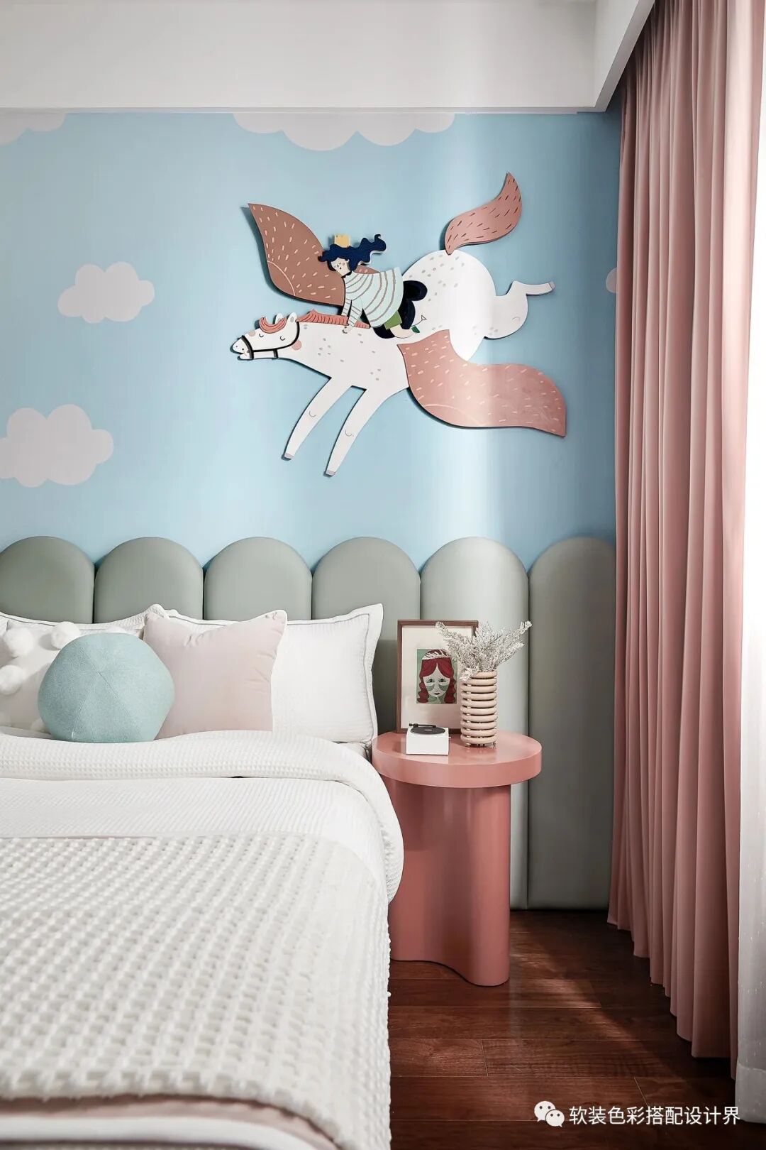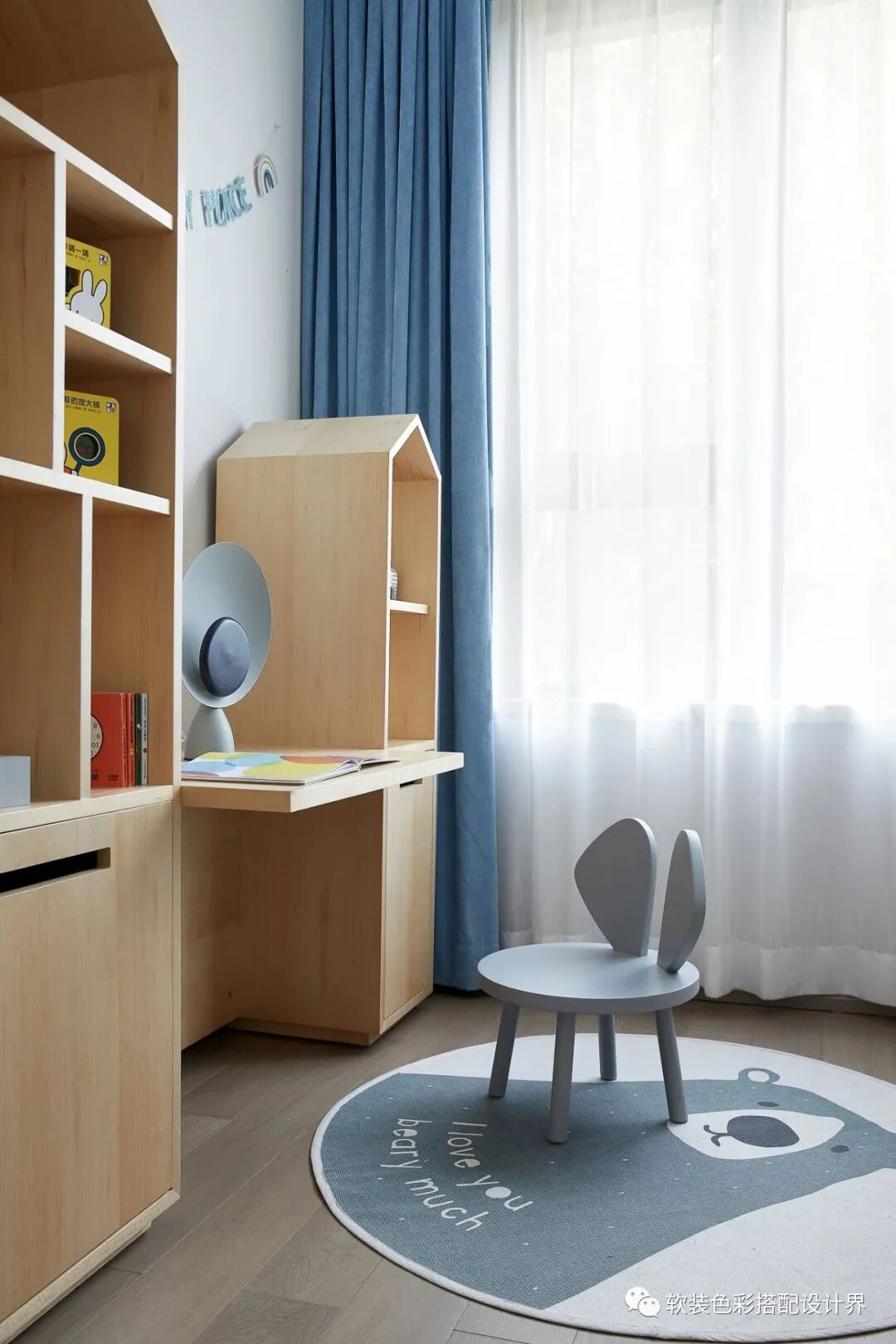 儿童区的陈设设计,不仅要考虑到居住的舒适,还需要让它充满欢快、童趣与创意的气氛。比如采用浅淡、柔和的色系作为大面积打底,局部小面积可以加入一些动感的鲜艳色,让空间充满活力。图案和造型多用一些卡通、圆润的式样,会让空间更具有可爱感和趣味性。