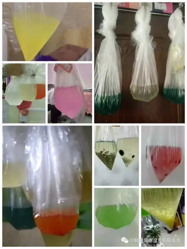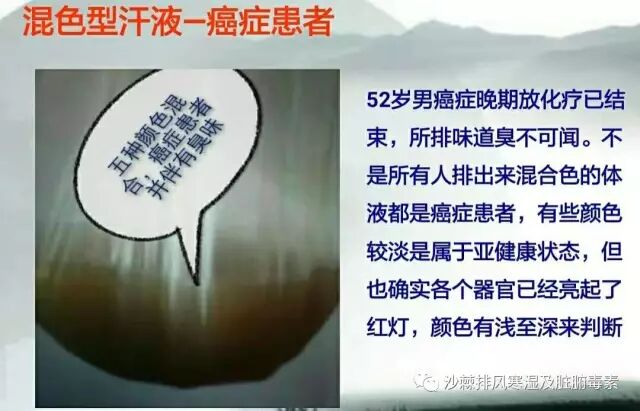 我们做的不是排汗,我们做的是排风、排湿、排寒及脏腑的毒素,各种毒素排出来是需要一个载体,汗液就是这个载体,所以我们最后要通过出汗,把毒素排出来,而且体质不一样排毒的体液颜色也不一样,五颜六色。