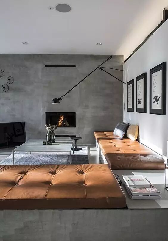 清水混凝土的色彩和质感质朴,浑厚,但也会产生冰冷的空间感,而和皮革织物等材料搭配组合使用后,便形成了微妙的平衡,带来亲切与柔和。