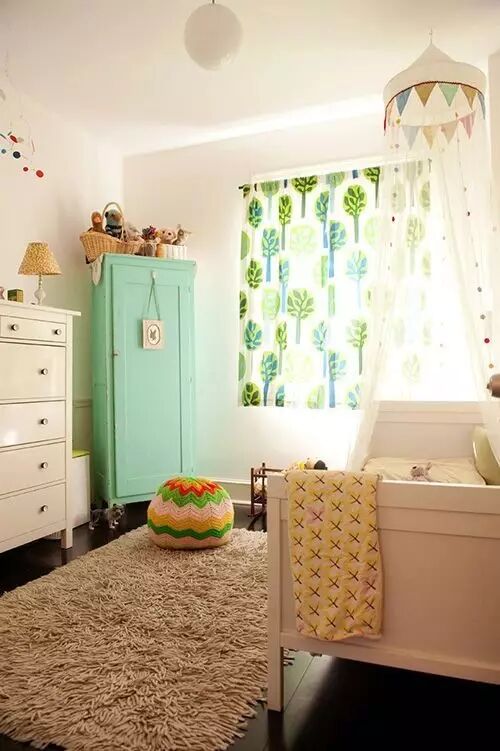 稍大一些,可以把婴儿床换成儿童床,摆一些厚的软垫在地上让孩子在上面爬爬跳跳,铺上柔软的地毯即使摔倒也能起到缓冲和保护的作用。