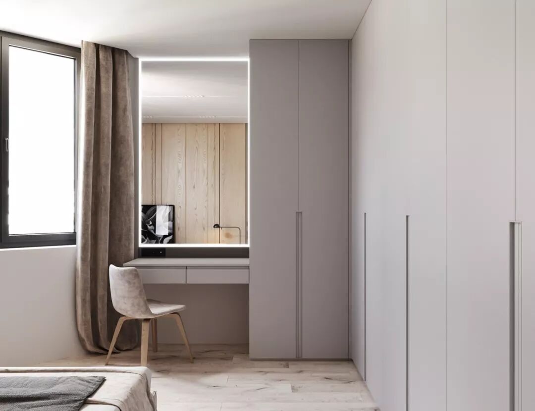 在小小的卧室空间里,组合衣柜最大的优势就在于,它不仅仅发挥了纯粹的衣物收纳功能,还可以与书桌、书架、化妆台、办公区等组合起来,有着超乎想象的实用性。