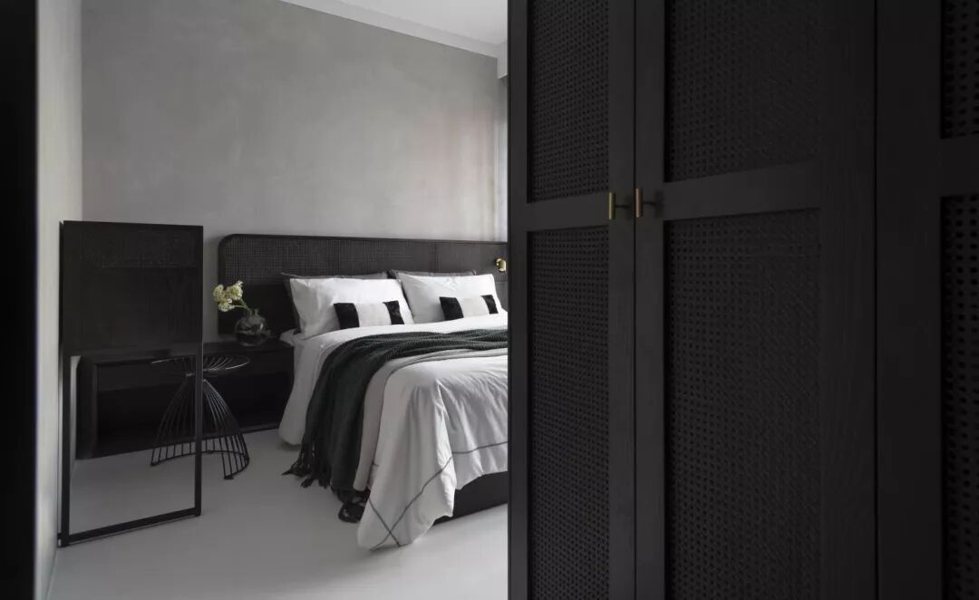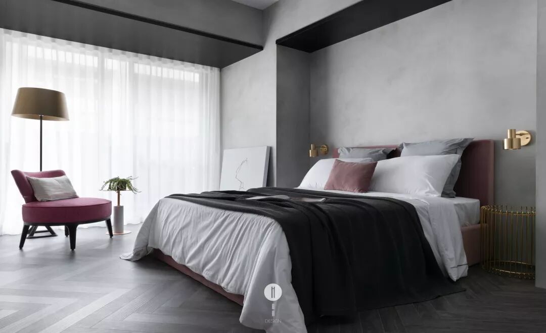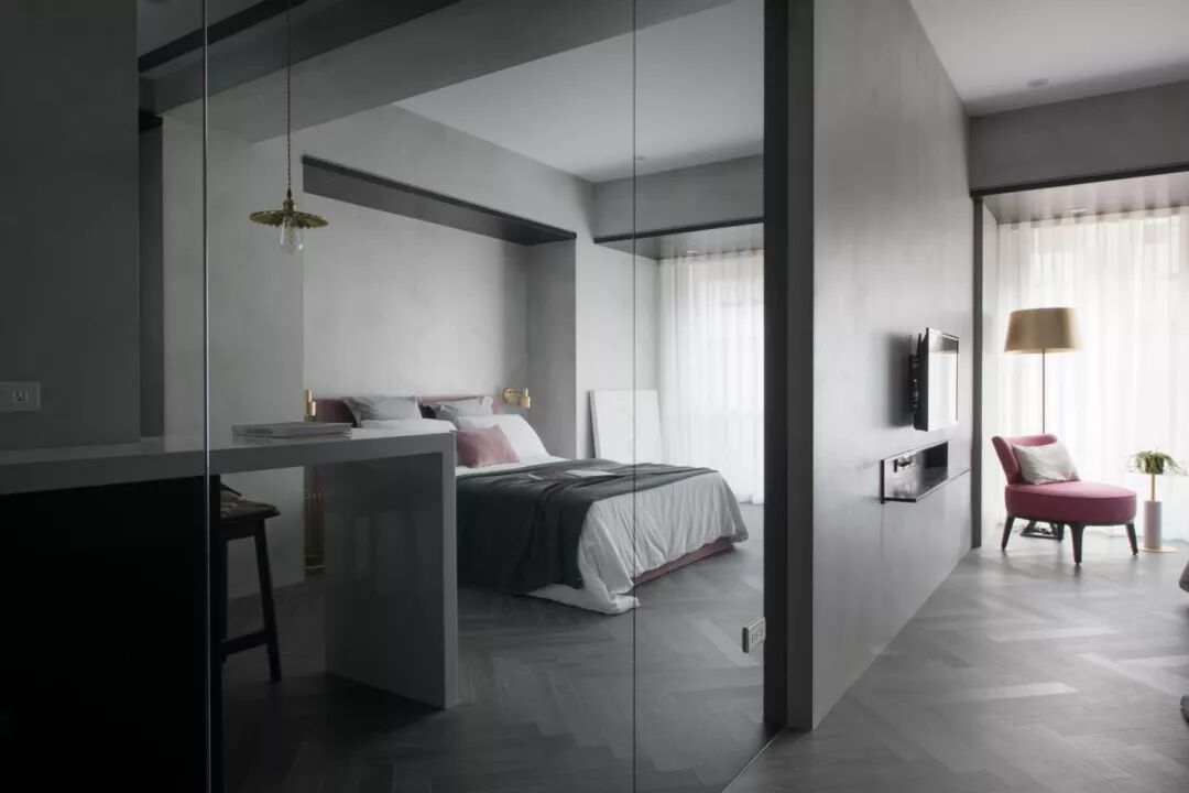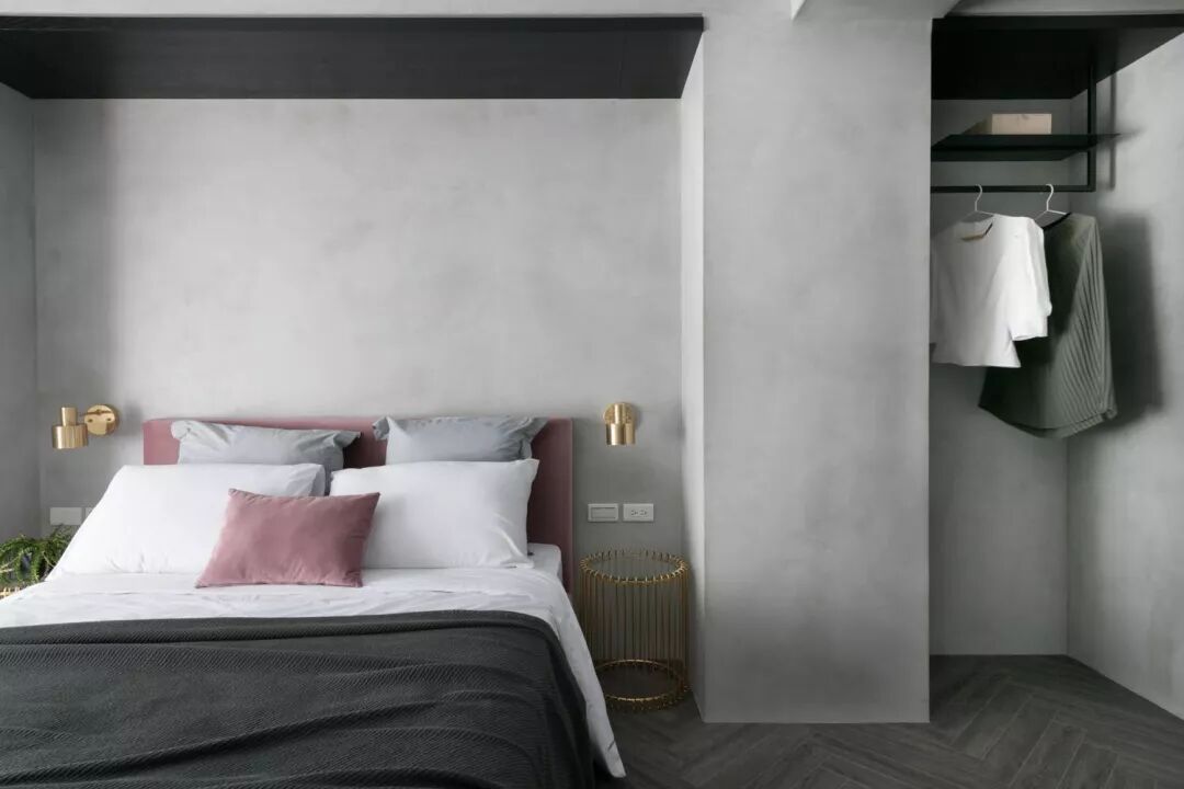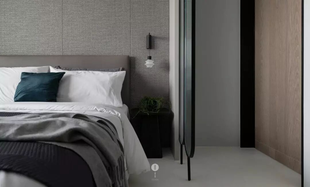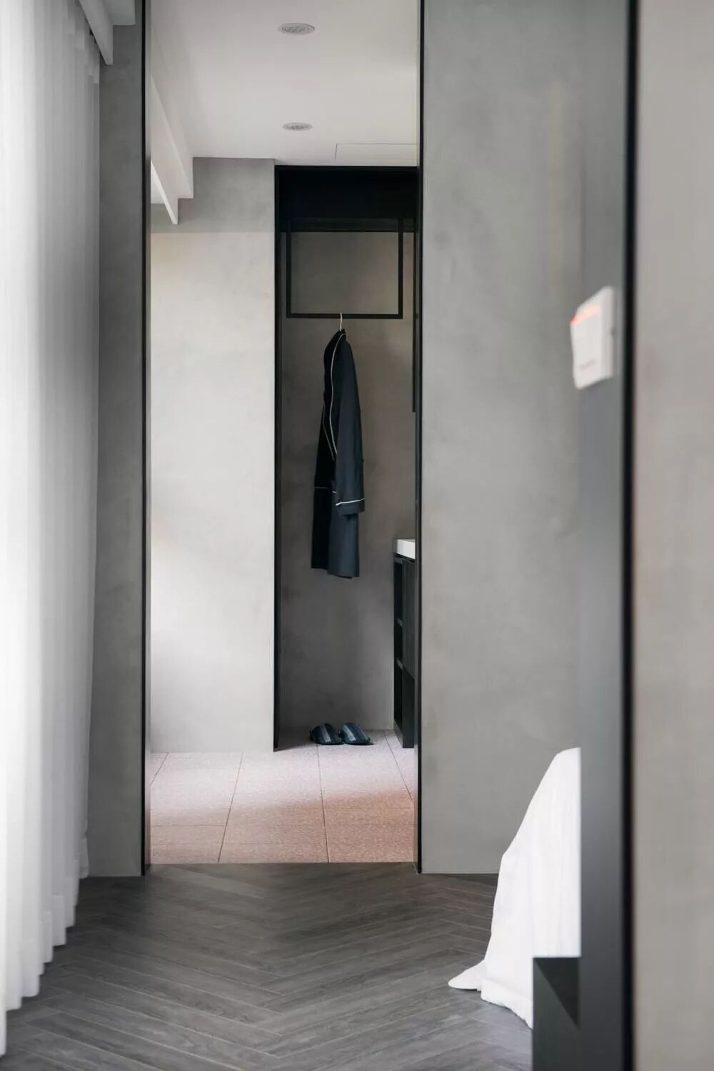 卧室空间延续墙面漆上仿清水模特殊漆料呈现简约干净的风格并弱化房内梁柱,而人字拼木地板则提升空间暖度,最后运用整面的镜面门片放大空间视觉感受。