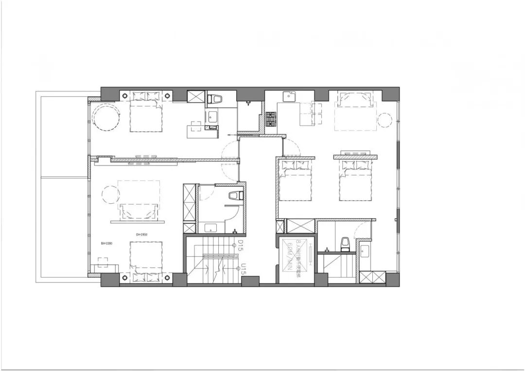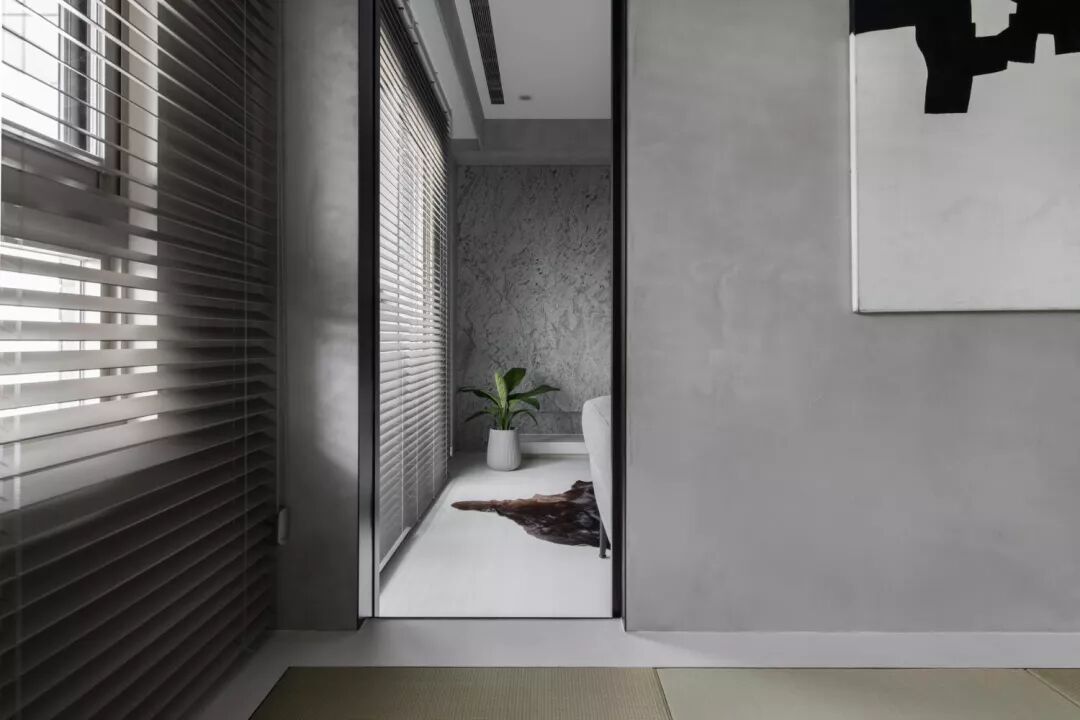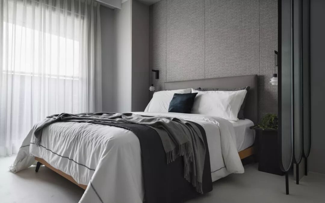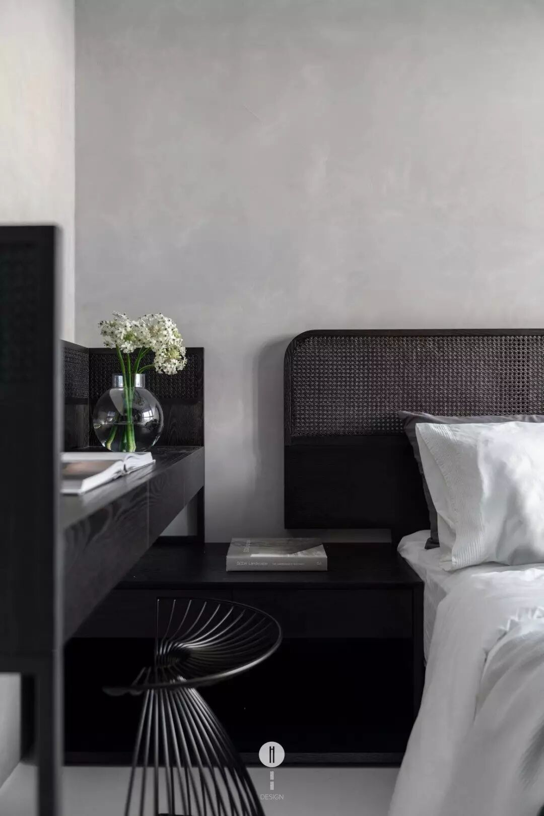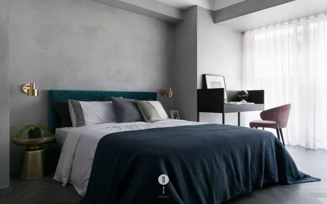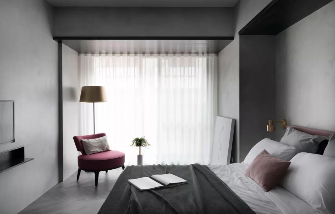 卧室空间延续墙面漆上仿清水模特殊漆料呈现简约干净的风格并弱化房内梁柱,而人字拼木地板则提升空间暖度,最后运用整面的镜面门片放大空间视觉感受。