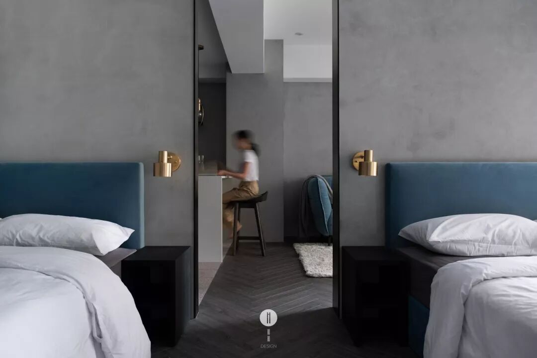 民宿内的三个房间各施以湖水绿、粉红、蓝色跳色区隔所属氛围,并以金色系的茶几、吊灯、壁灯、边桌勾勒空间质感。