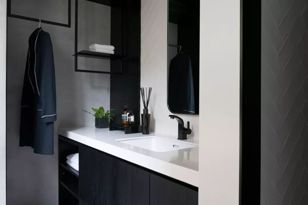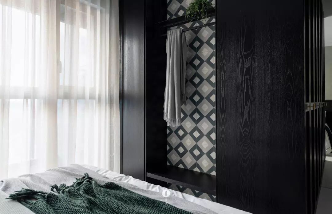 卫浴延续室内干净简洁的风格,但改以黑色五金增添中性性格也让空间更有层次,壁面将瓷砖人字拼贴也与房内木地板相呼应成为亮点。