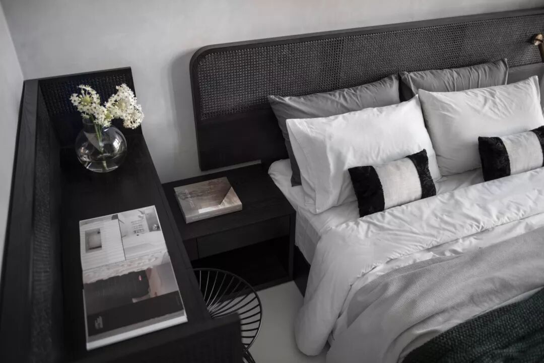 在家庭式套房内,入口玄关侧设置吧台满足房客煮食需求,而双人大套房内则以藤编屏风区隔起居空间与卧房,并让视觉通透放大空间感受。
