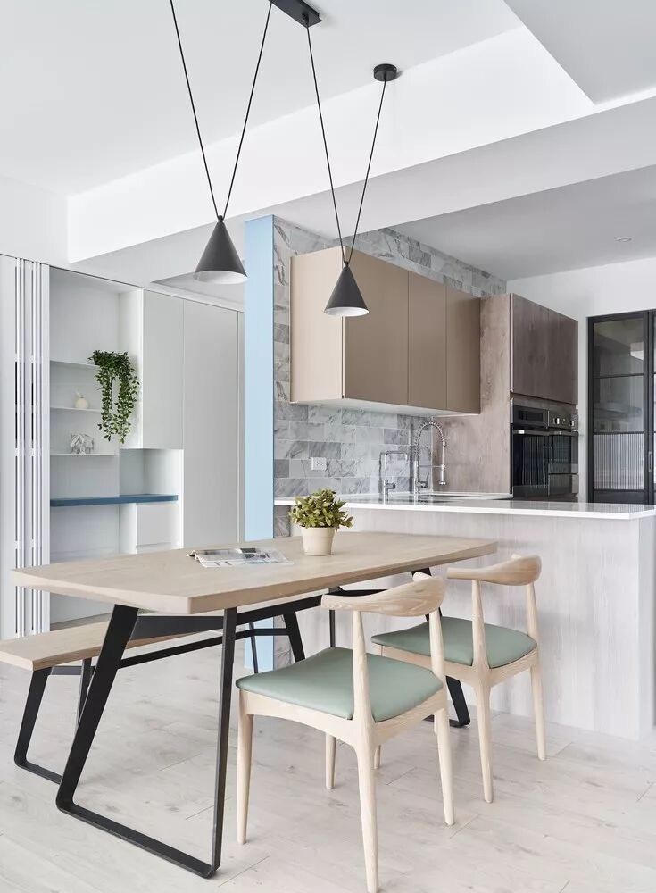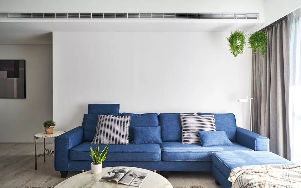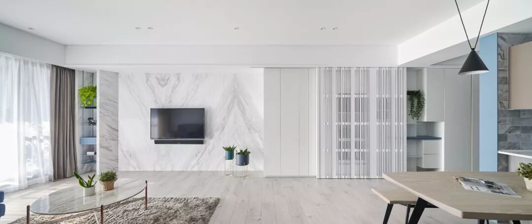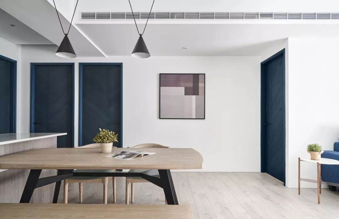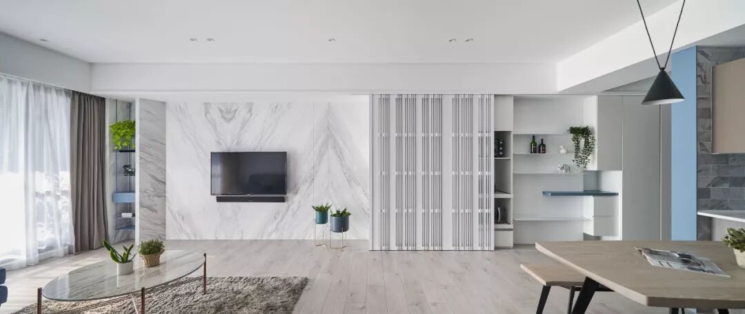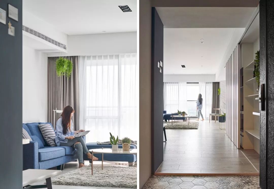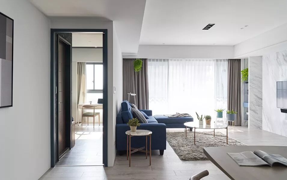 现代简约白色基调、配上蓝色的沙发,木质的地板,时尚清新自然,加上设计师独特的品味,才能涵养出专属于居住者的生活风格。那已经不单是视觉美感的铺陈,而是要让空间活起来。