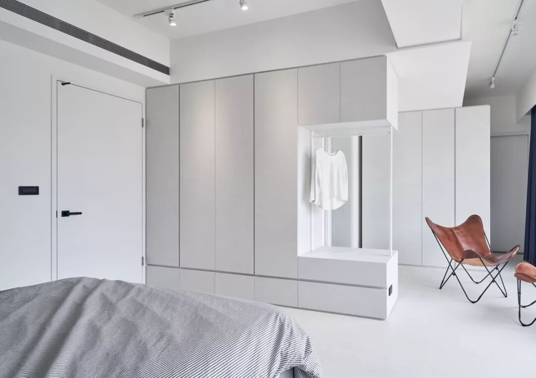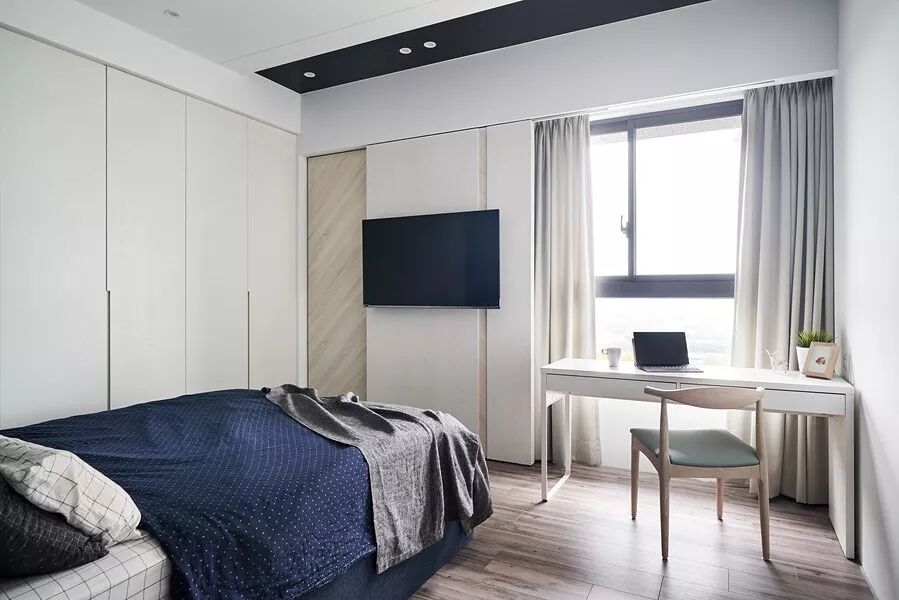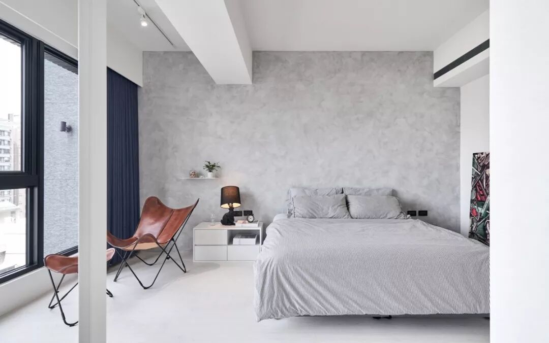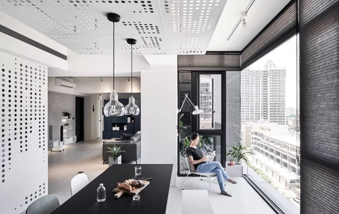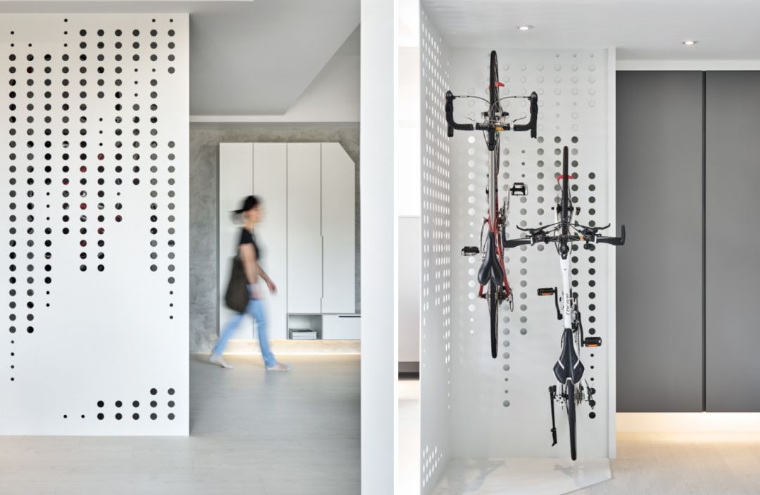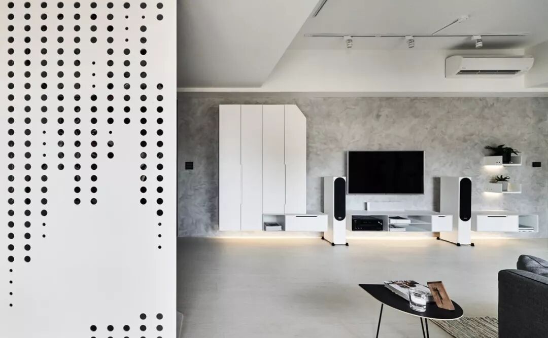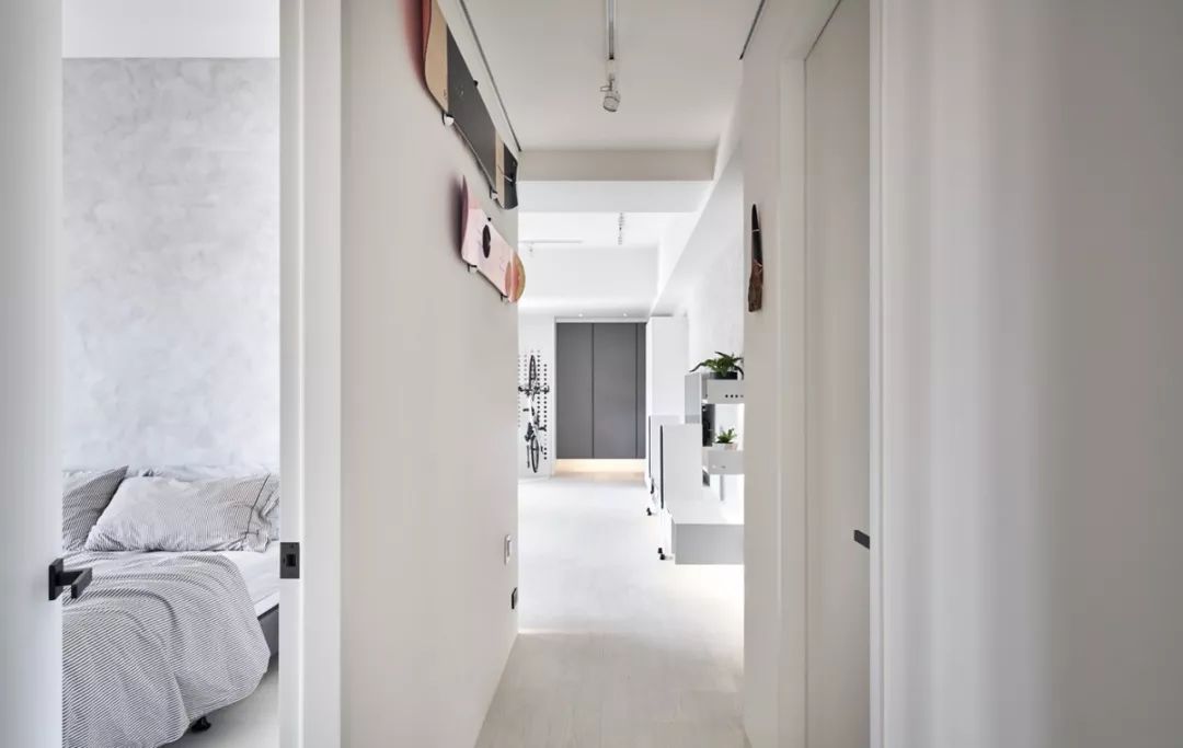140㎡现代风,借用充足日光与低彩度空间交织出净、透、亮、白的质感印象,另外,从立面延伸至天花处的洞洞板设计、手刷感石灰色墙面,感受出纯白空间的个性层次,并巧以深海蓝缔造视觉重点。