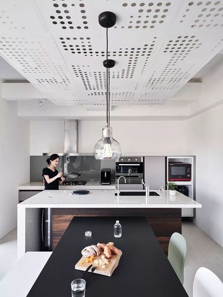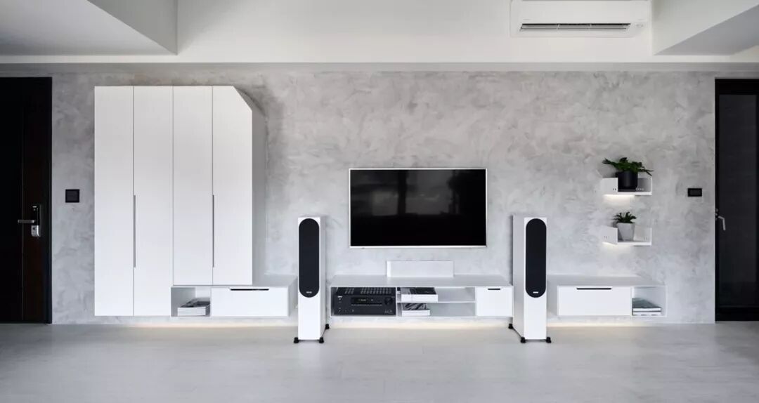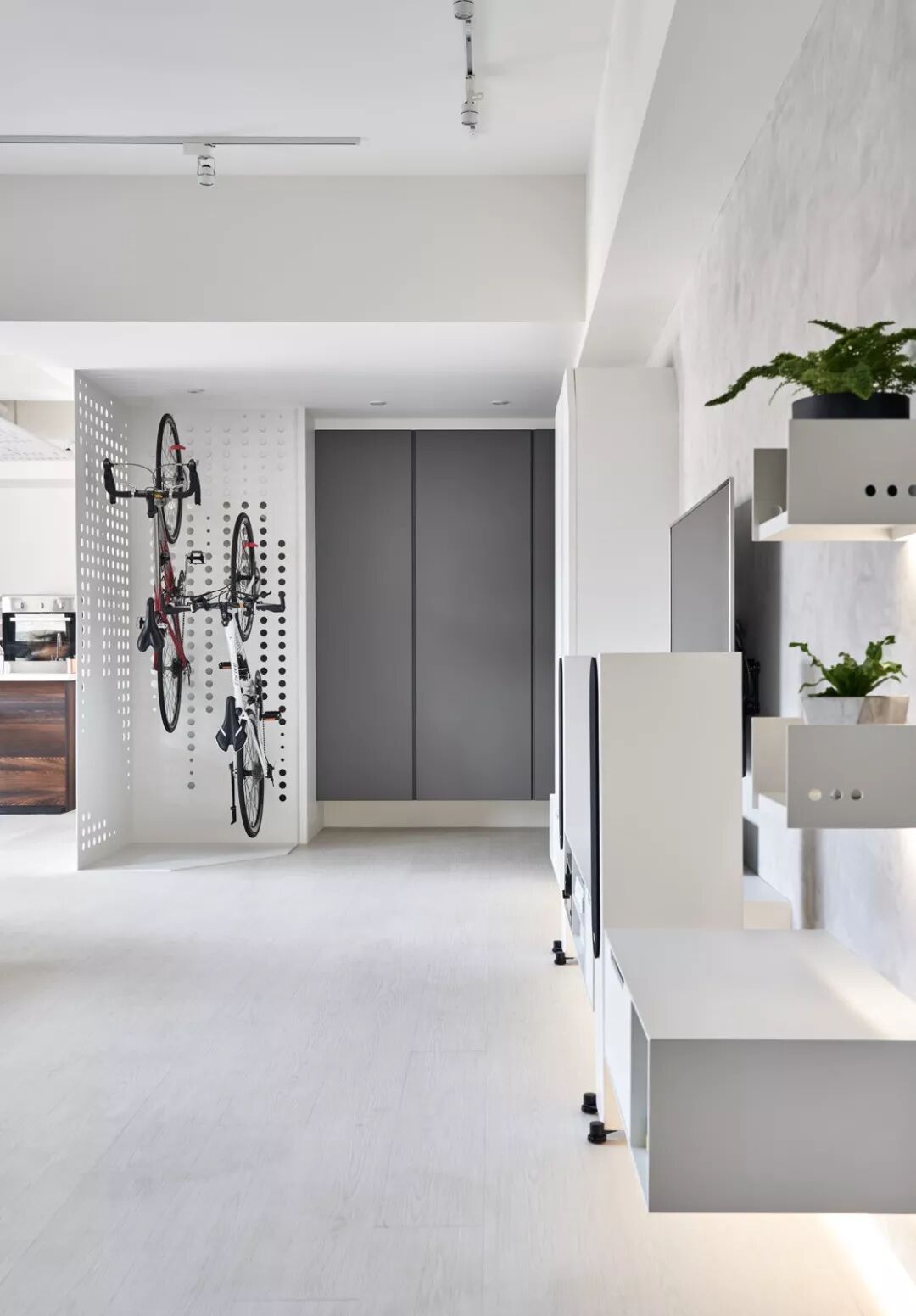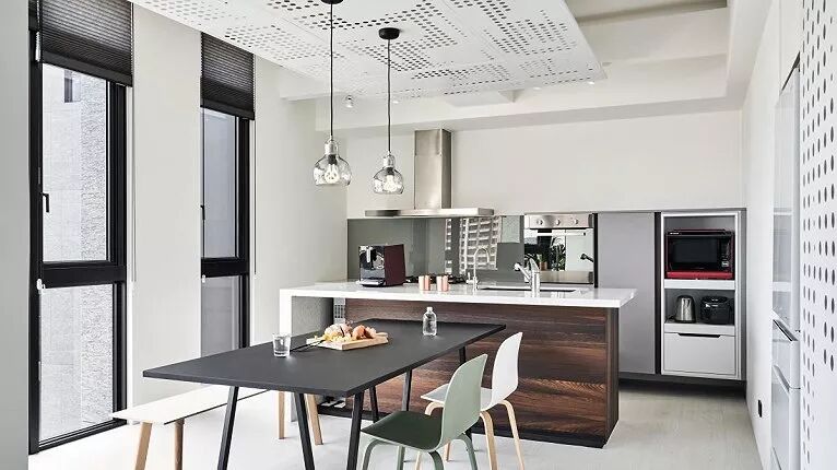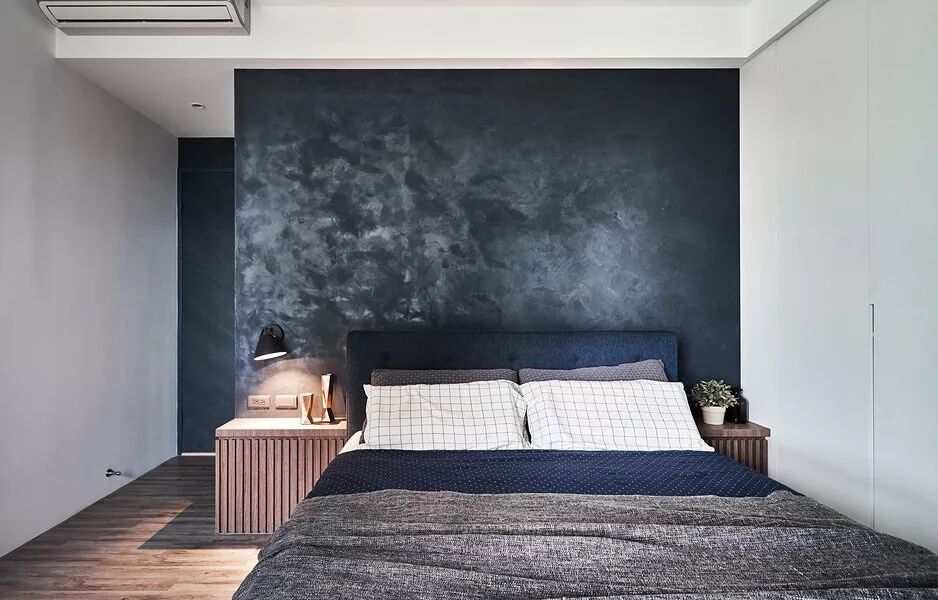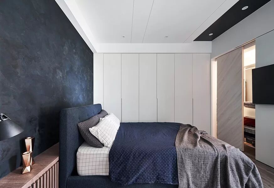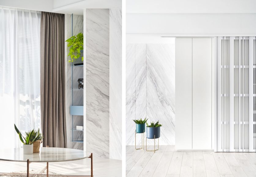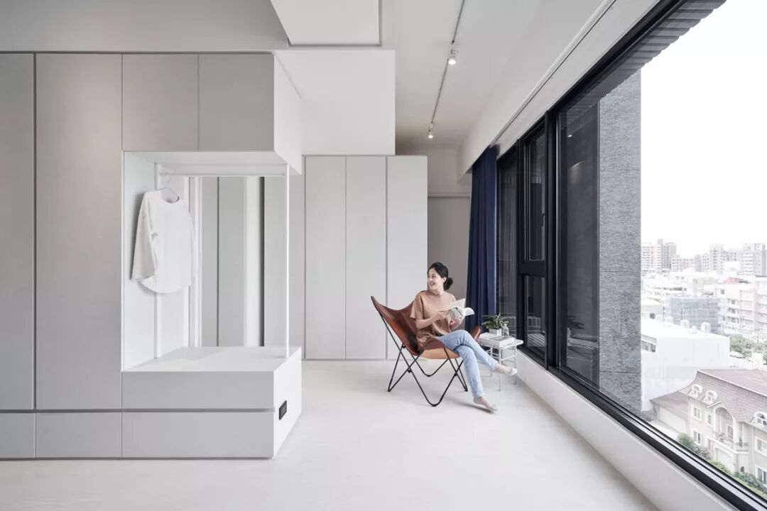 140㎡现代风,借用充足日光与低彩度空间交织出净、透、亮、白的质感印象,另外,从立面延伸至天花处的洞洞板设计、手刷感石灰色墙面,感受出纯白空间的个性层次,并巧以深海蓝缔造视觉重点。
