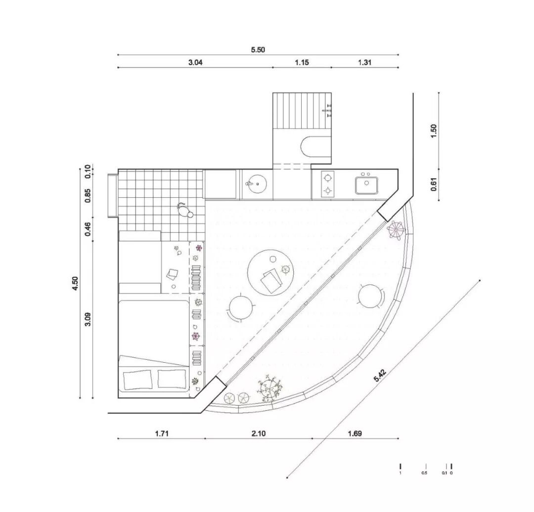 毫无疑问,这个小公寓的空间感通过增加这7平方米的空间得到了加强,从街道一侧的立面上可以看到它所有的白色波浪形的阳台。