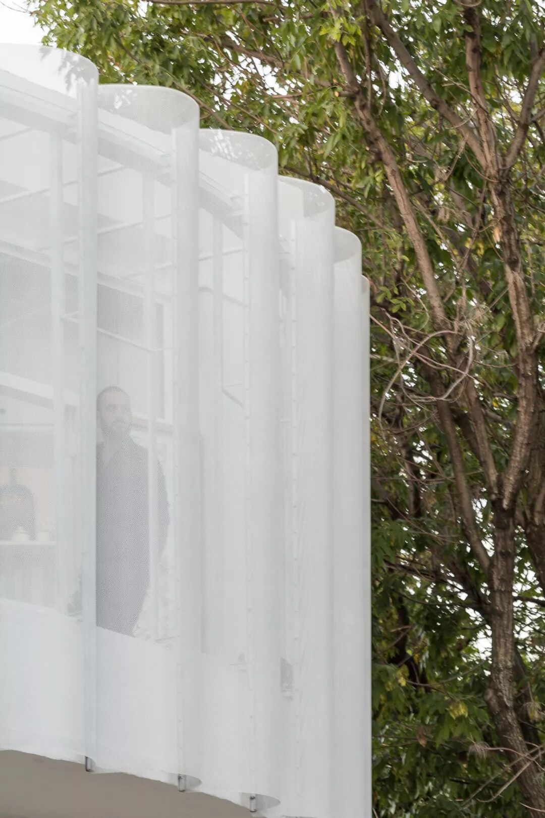 从外部看,阳台——包裹在精致的白色波浪状穿孔结构中——既异想天开又完全现代。