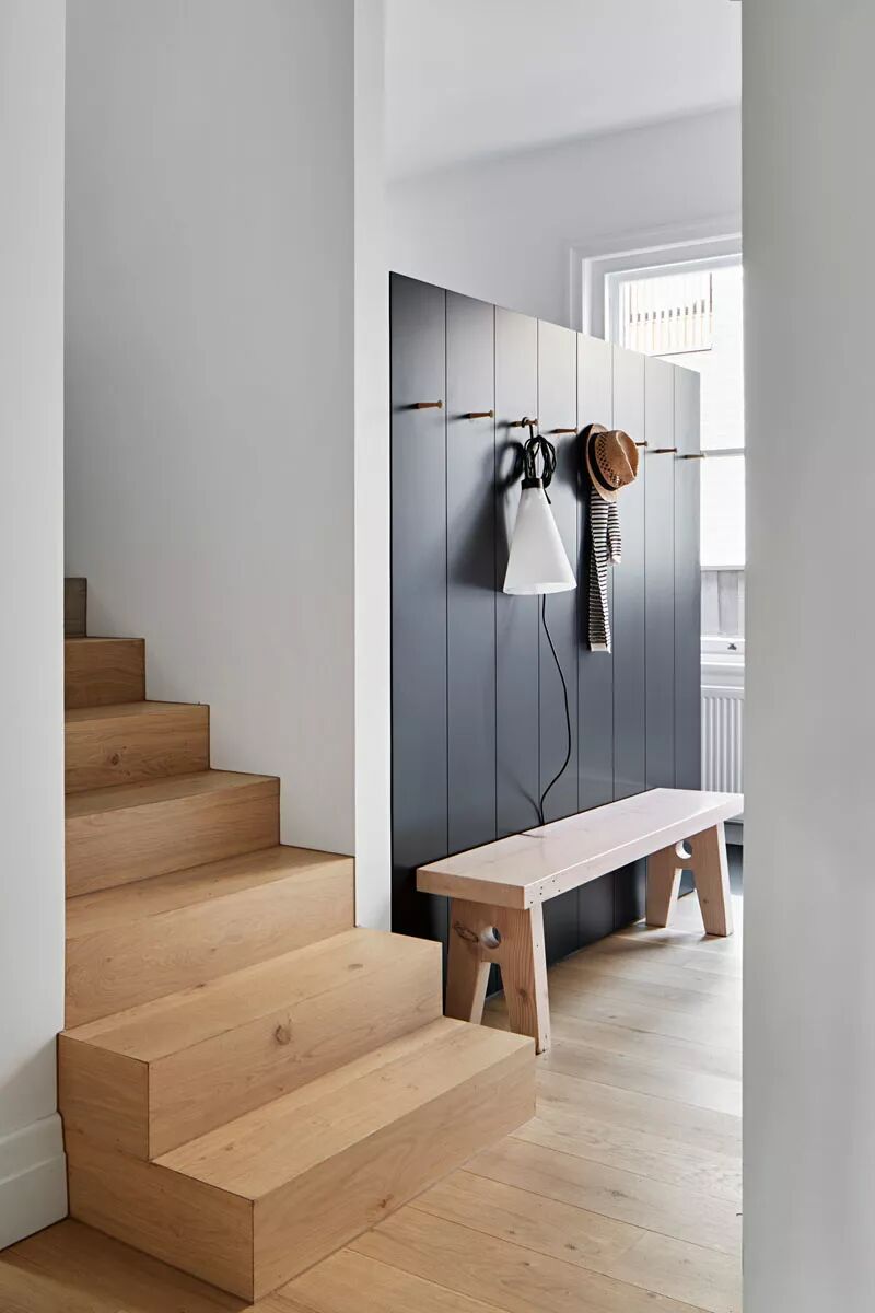 ▲入口处设计师定制了黑色的木墙,便于进出门物品的悬挂,黑与白的配色对比鲜明,很好的折中于经典与时髦之间。