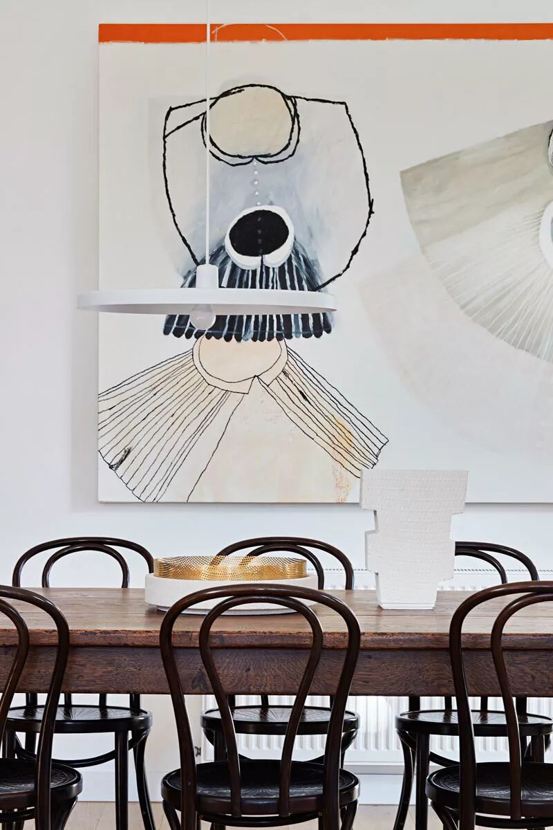 ▲屋主要求空间可以体现过去,也能感受未来,设计师最终选择利用餐厅区域满足屋主的想法,餐桌桌面上斑驳的痕迹彰显着它的历史,悬挂在墙面的装饰画却又拥有超前的艺术理念。