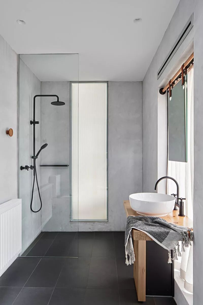 ▲清水混凝土的浴室与黑色的五金物件,搭配出硬朗简约的工业风。