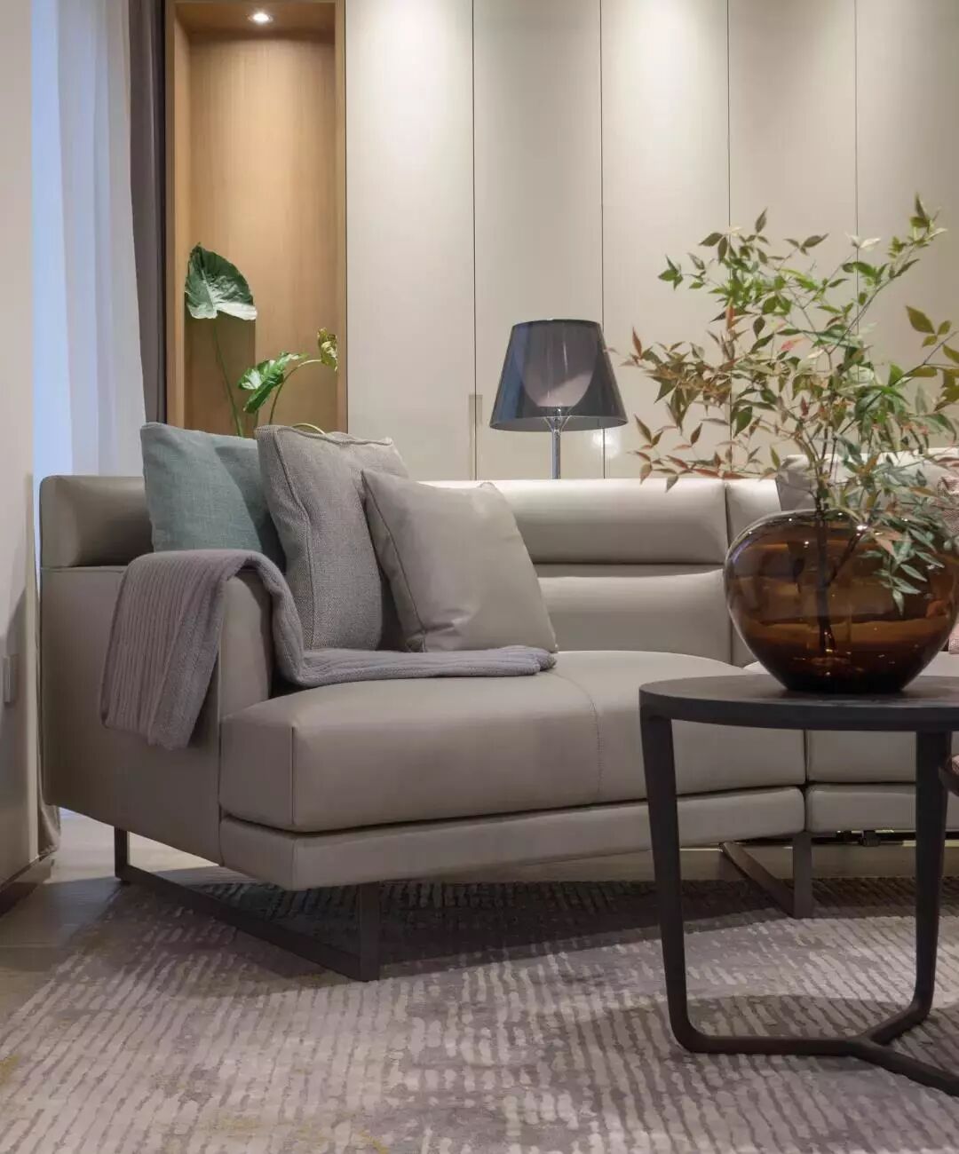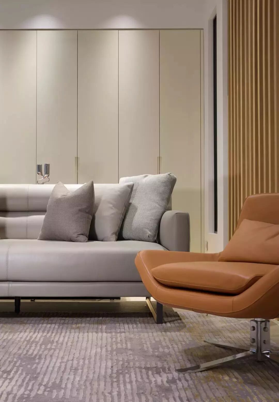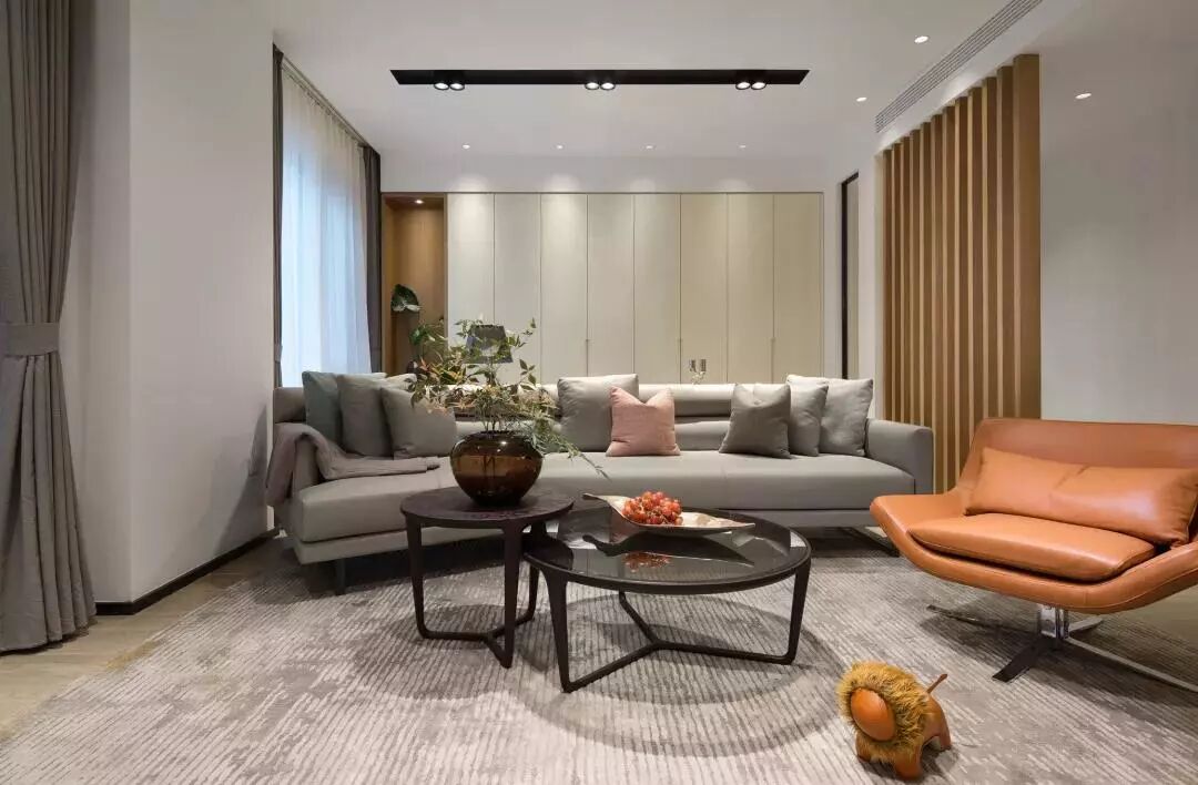 ▲一套简洁的灰色皮艺沙发,侧边一张橙色的休闲座椅,结合黑色双拼茶几,呈现出一个端庄舒适的氛围气息。