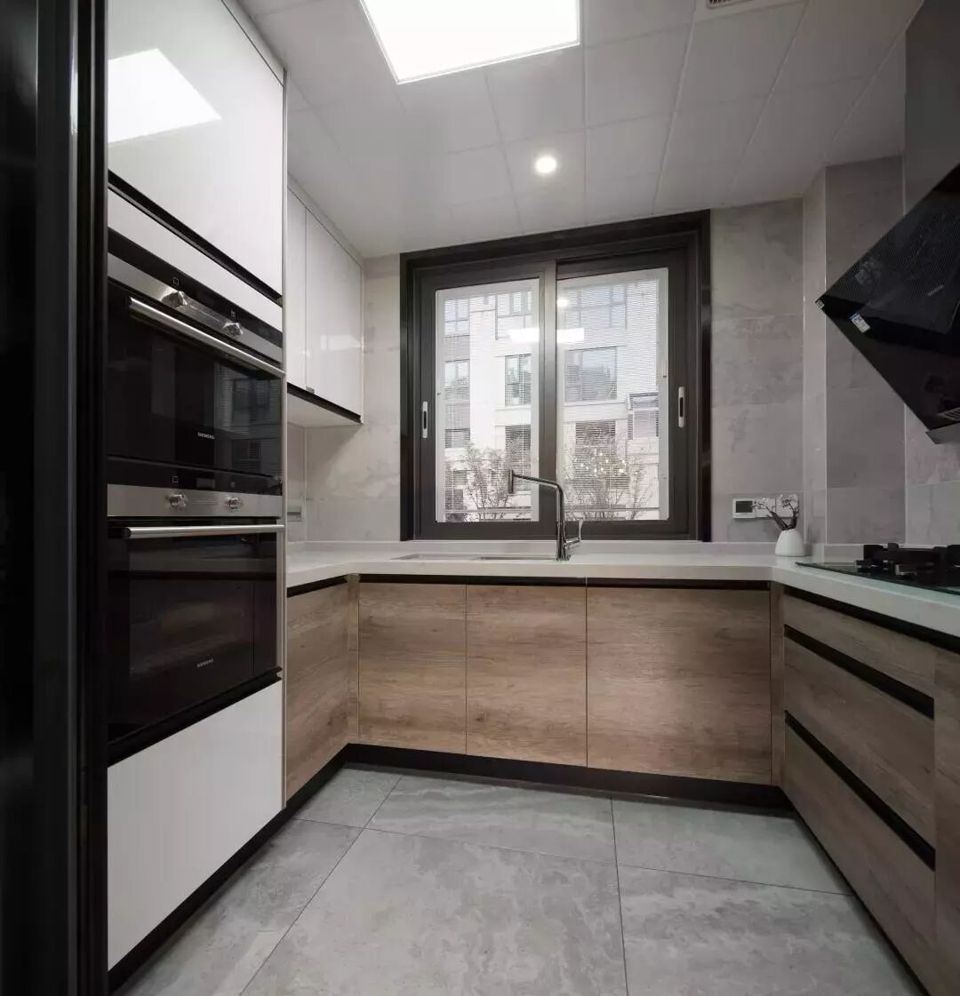 ▲厨房以灰色地面砖基础,搭配木质感的橱柜面板,整体显得精致简约自然。