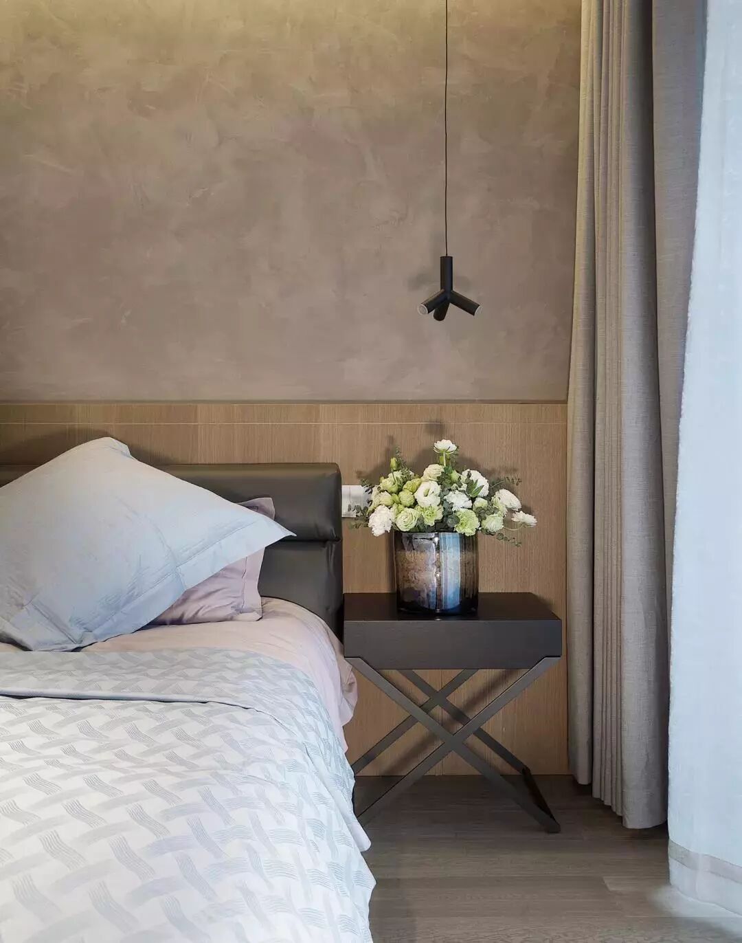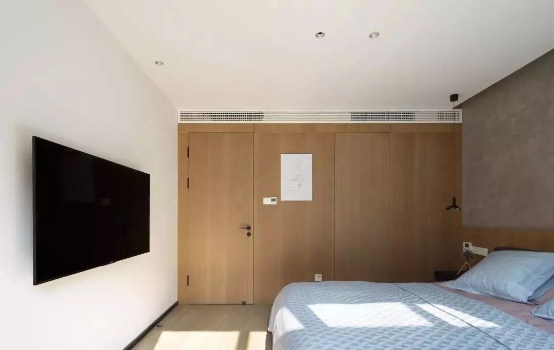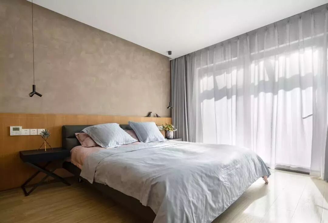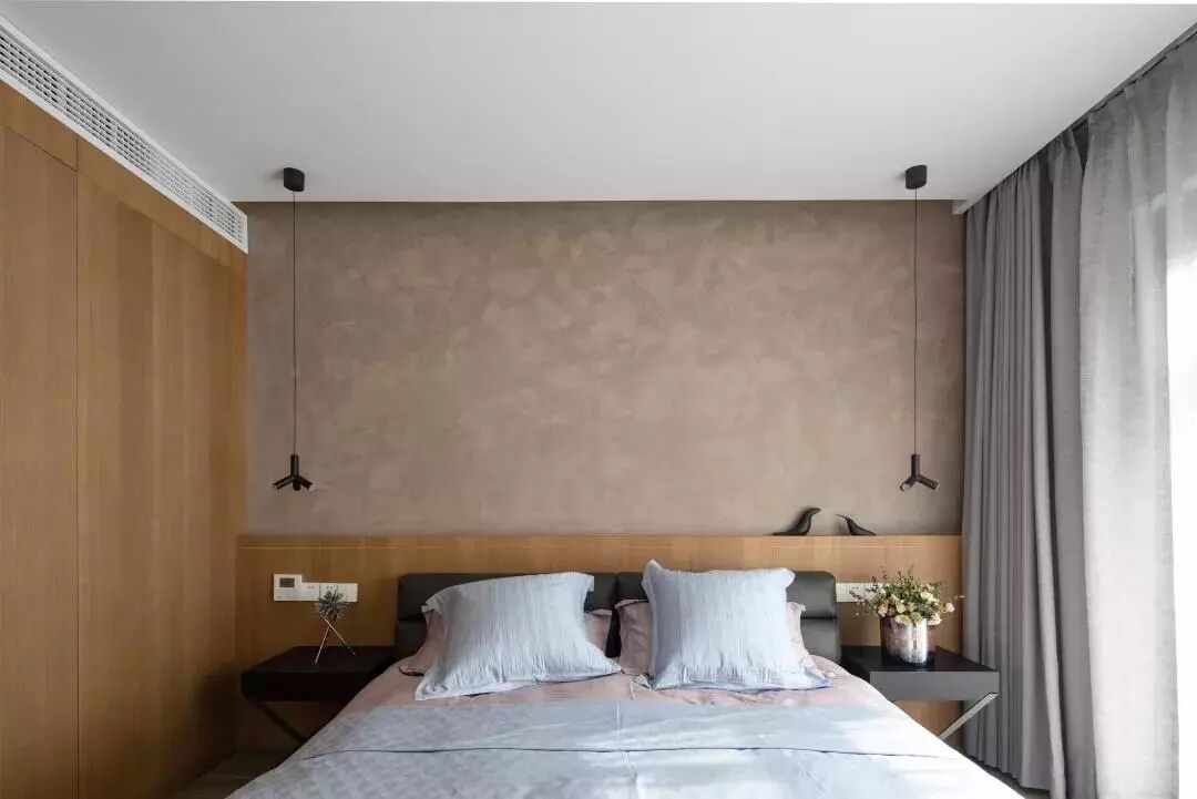 ▲卧室以灰棕色的床头墙,搭配木质隔层连着衣柜,整体空间充斥着自然舒适感。