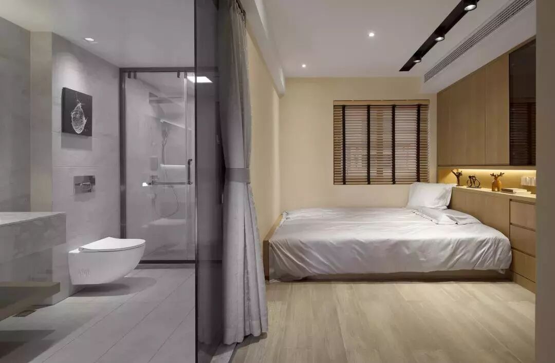 ▲一旁是卫生间区域,以玻璃+布帘隔断空间。