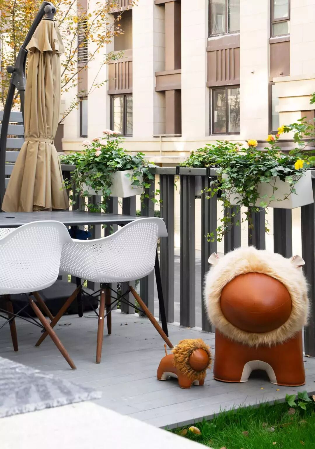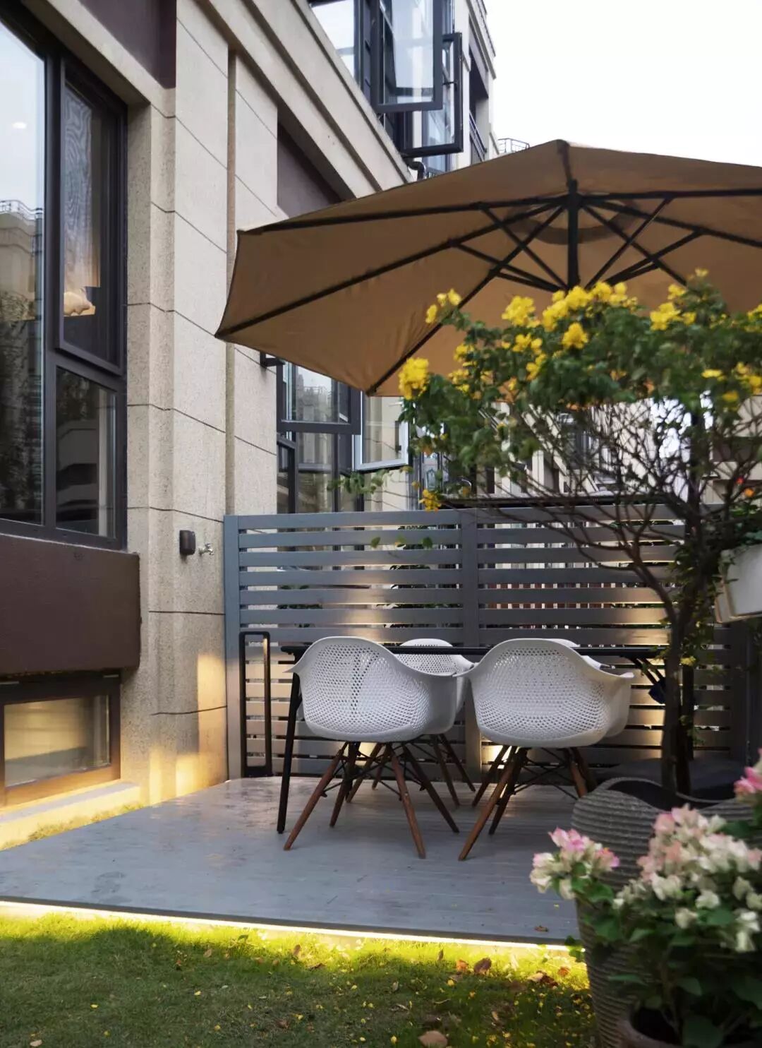 ▲花园一防腐木抬高地面,摆一套休闲桌椅,一把遮阳伞,整个空间充满了闲情逸致感。
