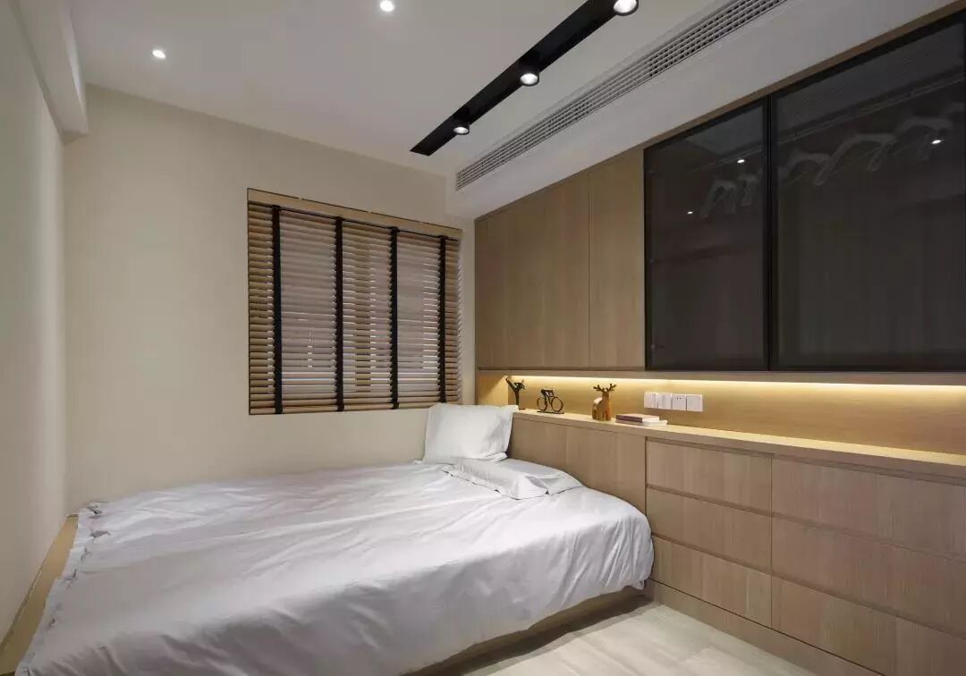▲米黄色的墙面,木质吊柜地柜,靠窗设置的床铺,紧凑的空间利用得极致。