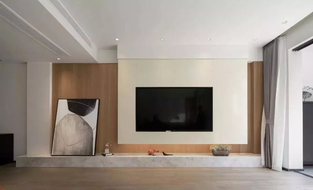 ▲电视墙底部是大理石案板,摆上装饰画与小摆饰,结合墙面的壁挂电视机,整体简洁的视觉,显得时尚大气。