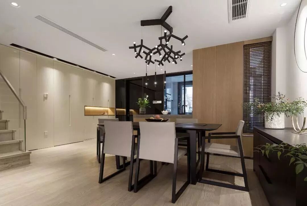 ▲餐厅的一组树根枝的吊灯,搭配上现代端庄的餐桌椅,整个空间充满了档次品质。