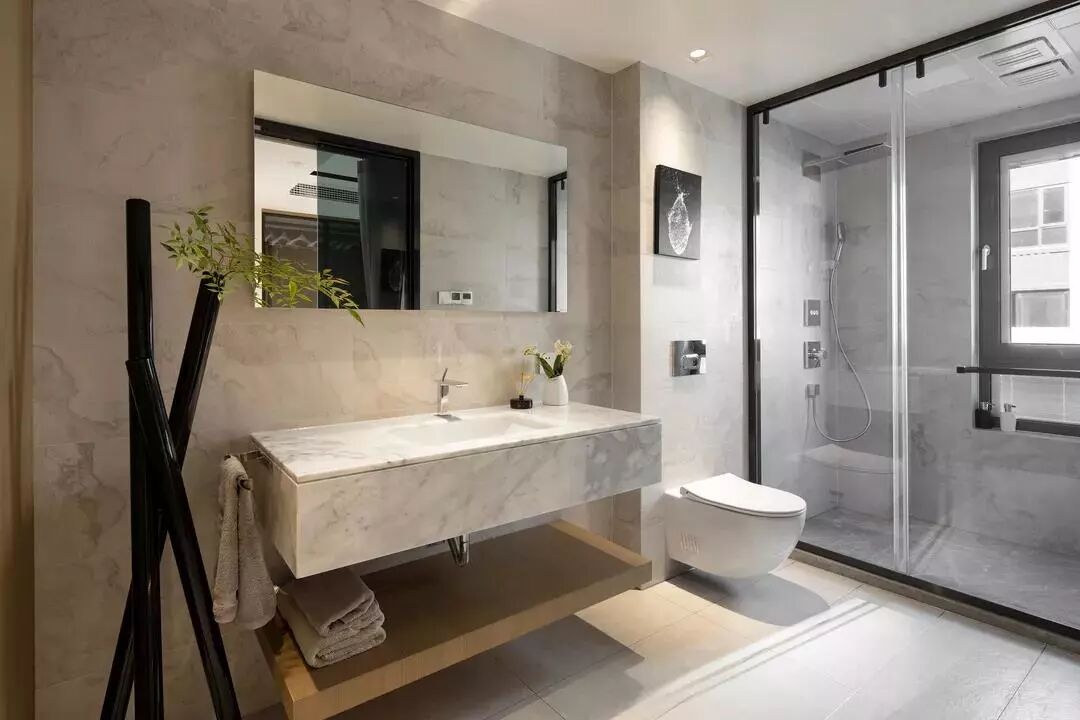 ▲卫生间以悬空式的大理石台盆,下方是一块木质的搁板,旁边还有一个黑色衣帽架,提供了实用而简洁优雅的氛围感,淋浴区简约灰调的氛围,呈现出舒适自然的卫浴空间。