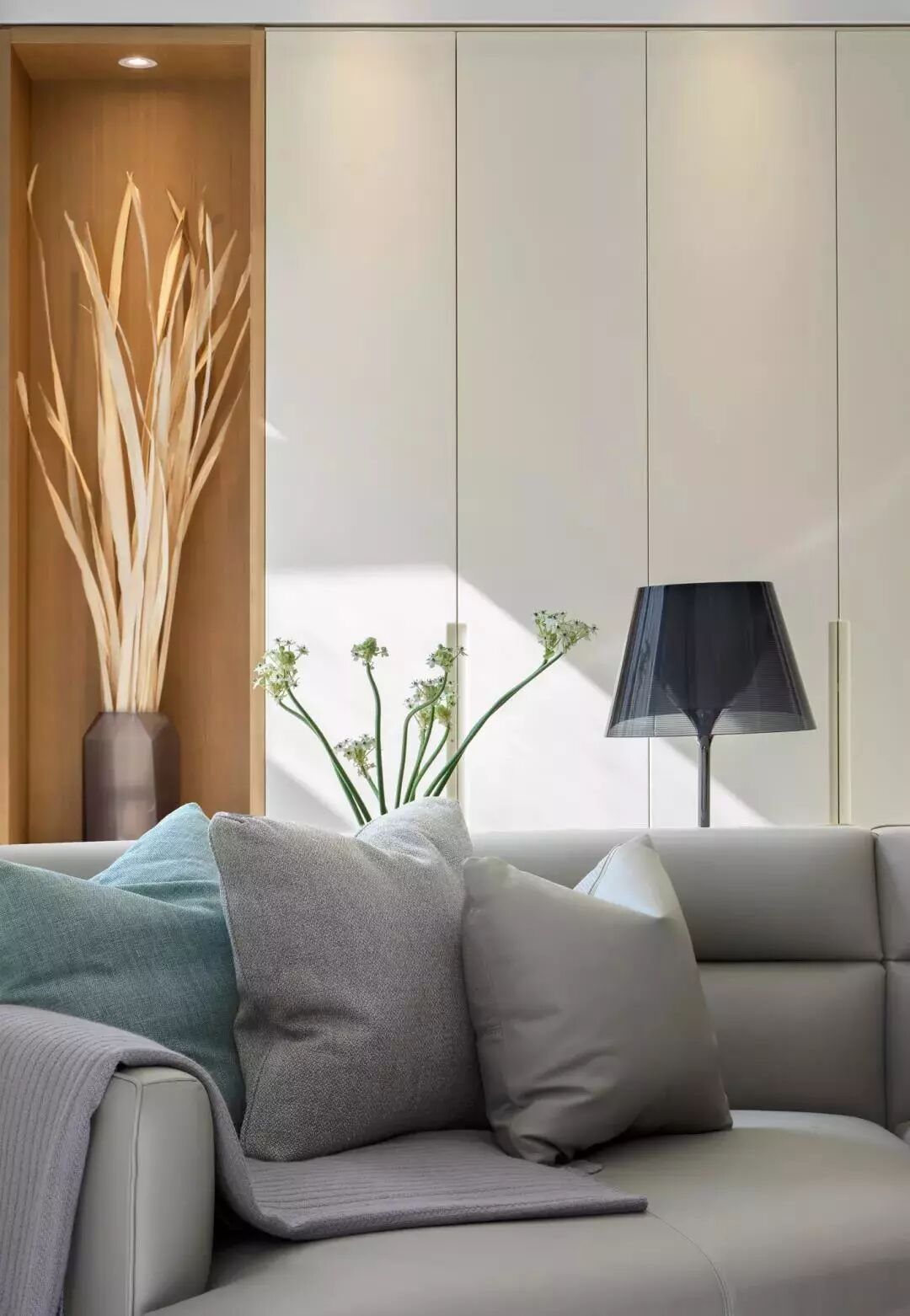 ▲沙发后方的这个柜体在白色柜门基础,加入一列的木质格架,使得空间充满了简洁优雅感。