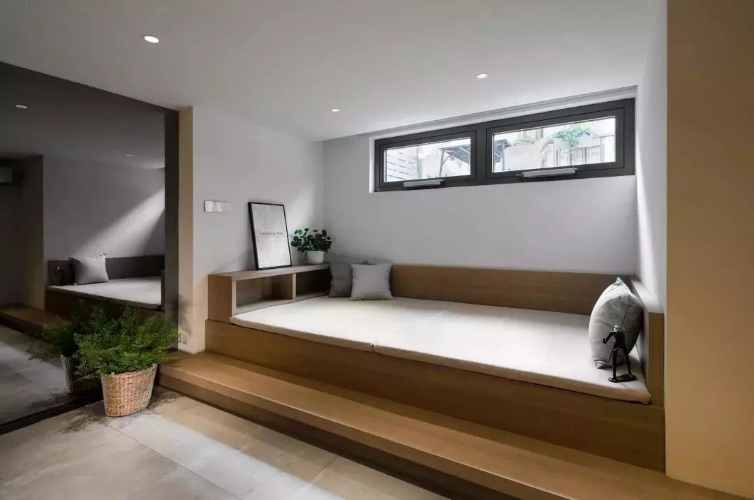▲地下室装了个小榻榻米地台,有个2个小窗采光,并以简洁的灯光辅助,营造出一个舒适轻松的休闲区。