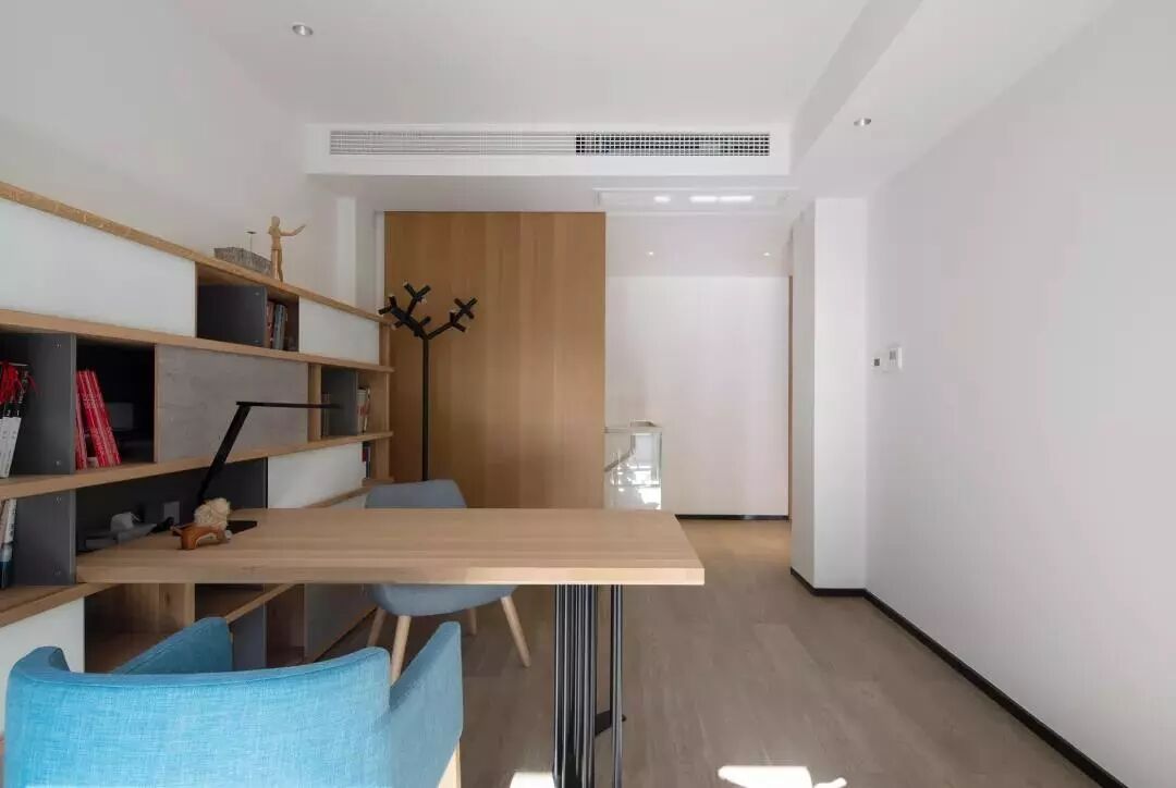 ▲对向而坐的双人书桌,侧边靠墙是矮柜书架,灰白配的书架,搭配木质书桌与两张蓝色的布艺座凳,呈现出简洁大方的视觉感。