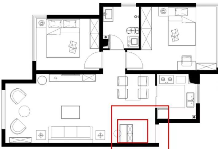 业主A的户型和下面的平面图相似,入户大门正对着餐厅,她想让入户空间能收纳物品,最好能挡一挡餐厅空间,下图是在入门的左边设置了一个柜体,能放置入门后需要收纳的物品,这种方法省事省力,能满足大部分业主的要求。