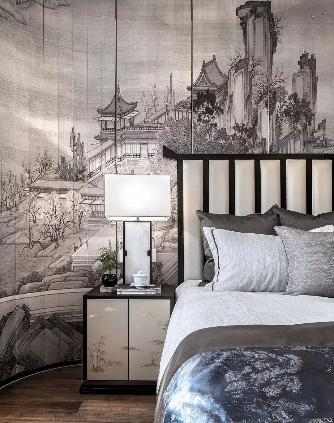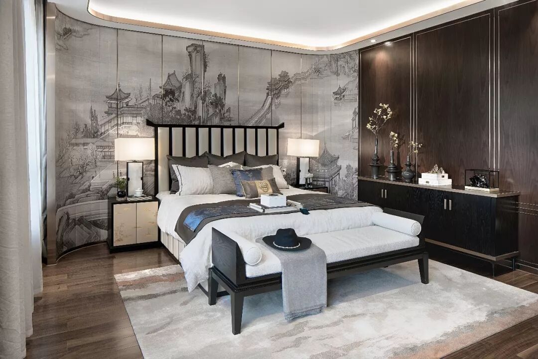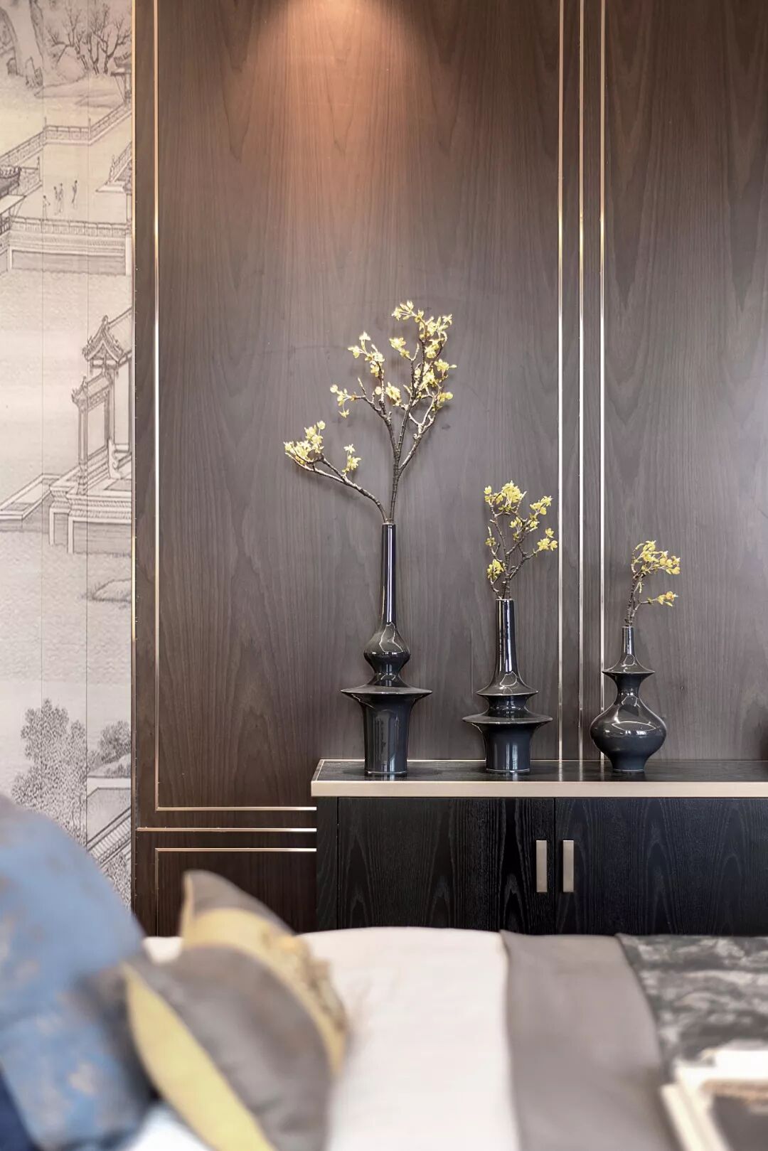 主卧位于三层,以金色衬托水墨背景,彰显用色之考究。恰到好处的东方印象便在此显露了,宁静惬意,以无声胜有声。