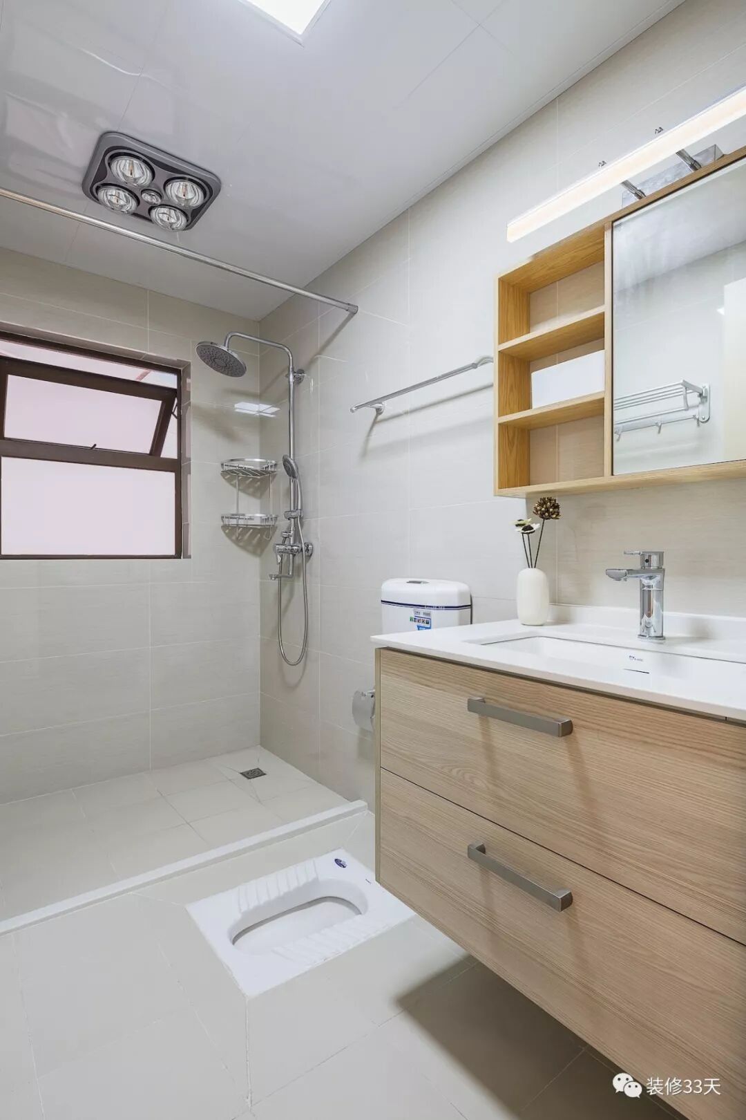 ▲ 卫生间整体通铺浅色瓷砖,空间色调统一不杂乱,蹲坑与浴帘空间显宽敞