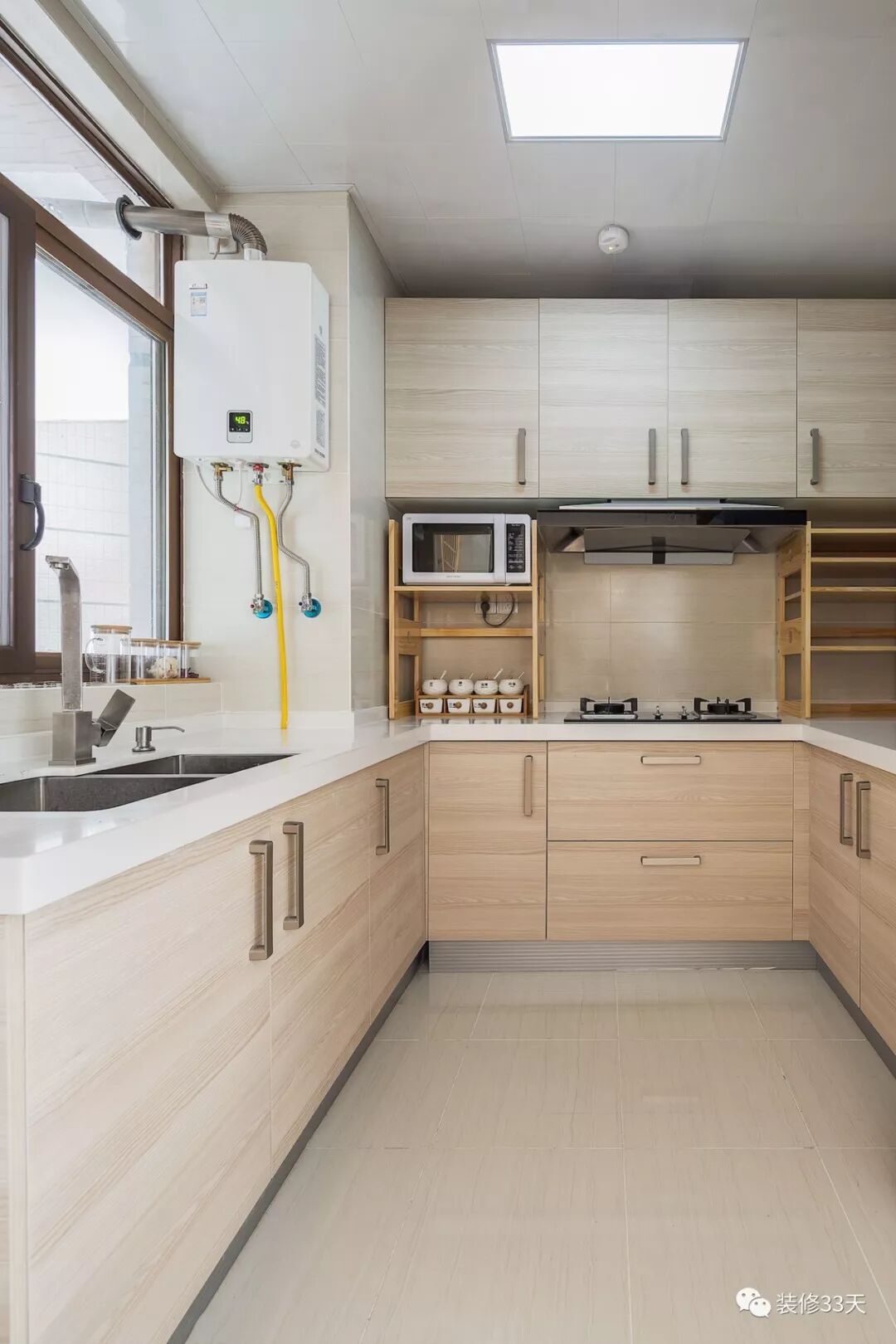 ▲ 厨房通铺浅色瓷砖,木色橱柜门片让料理空间变的轻松赋有质感