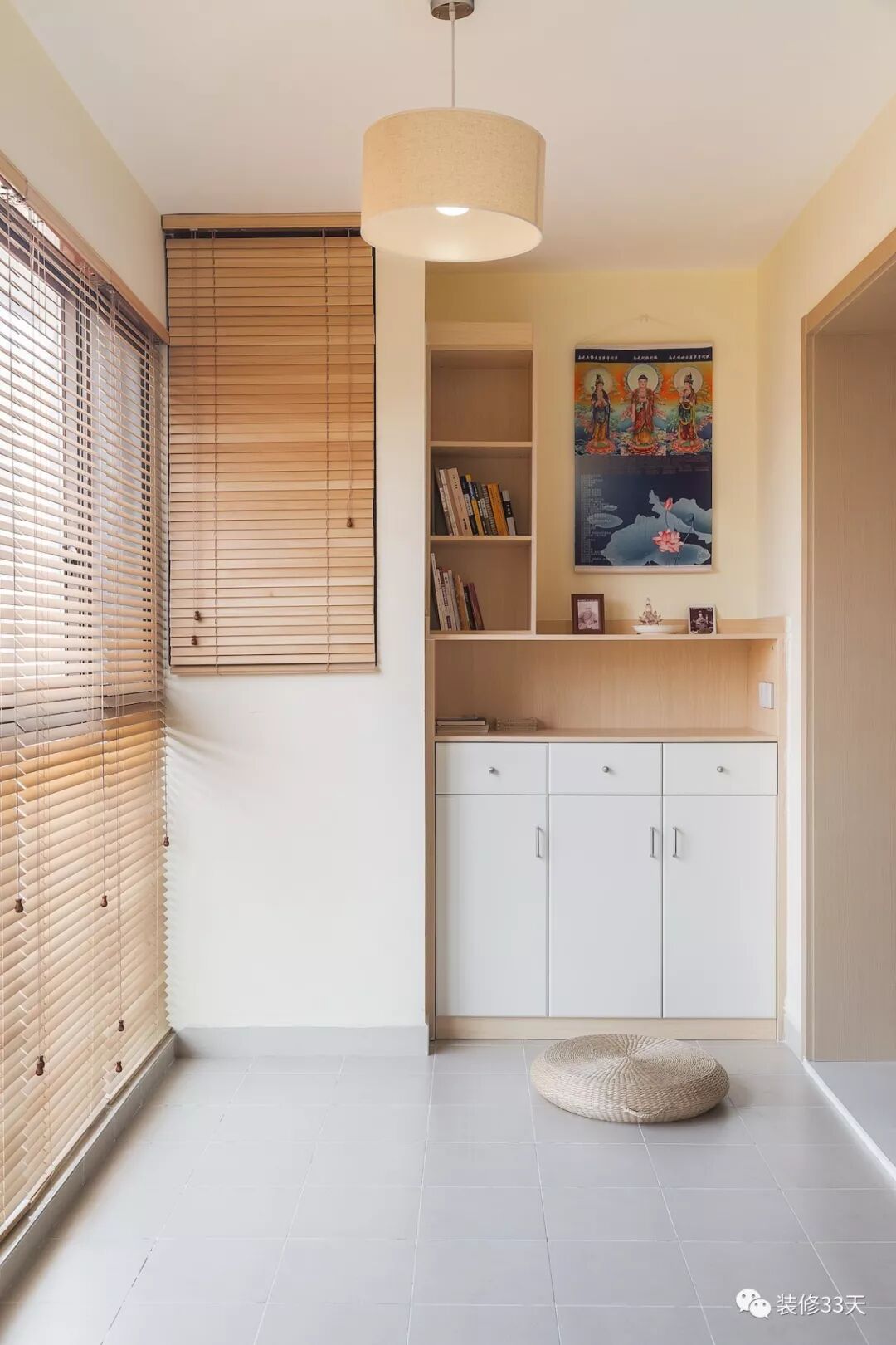 ▲ 阳台打造成佛堂,延续木色与白色的轻盈格调