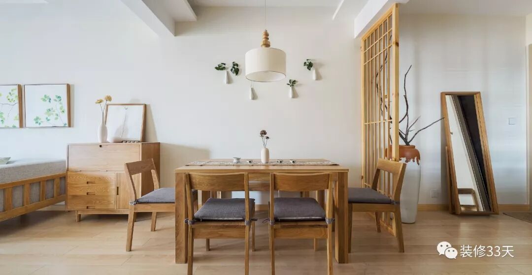 ▲ 餐厅一套原木色餐桌椅,搭配简约中式风的餐桌布置,背景墙上的四个花瓶墙饰与吊灯木质元素构成禅意韵味