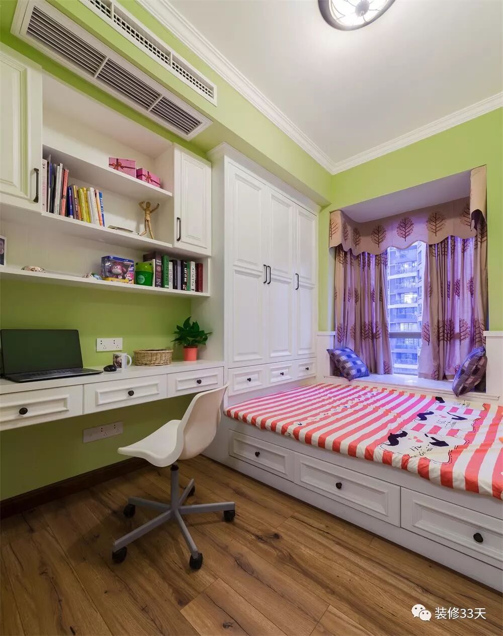 ▲ 儿童房整体以绿色为基调,木作白色家具,榻榻米结合书桌与吊柜,清新实用