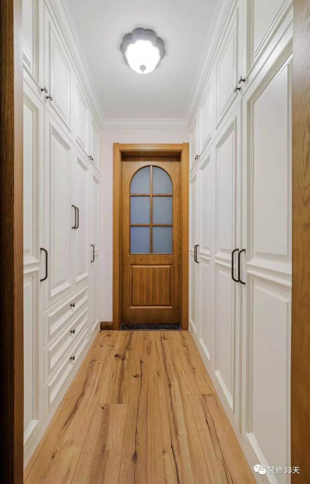 ▲ 衣帽间打造大量柜体,满足收纳需求,木色从地面延伸至门片,玻璃木门是卫生间入口