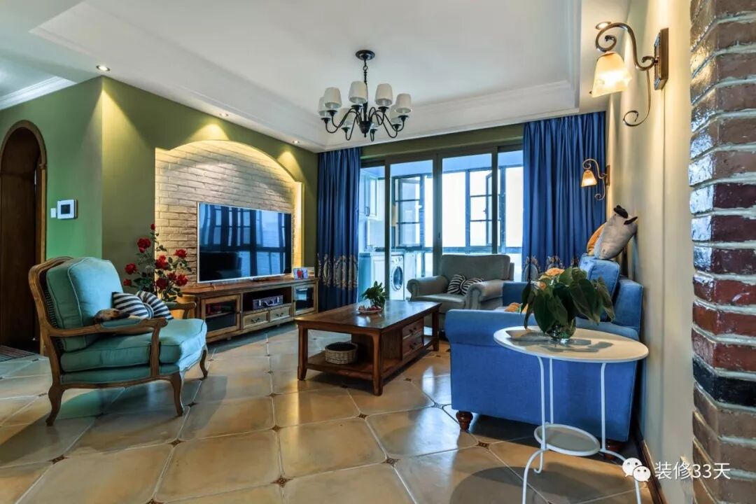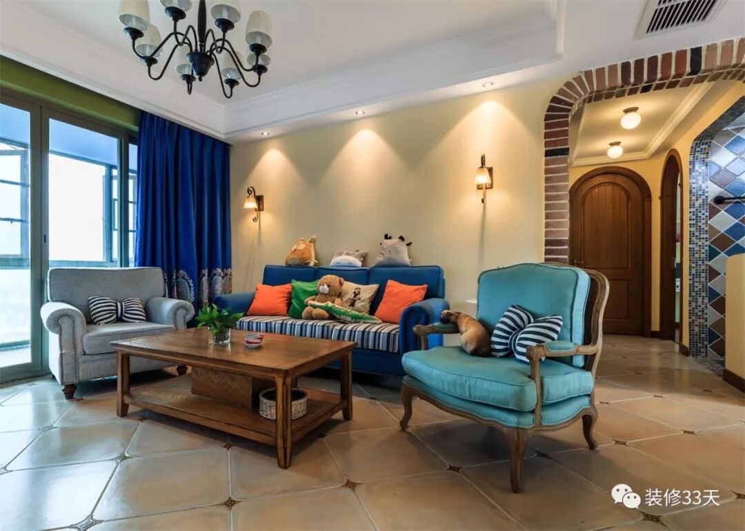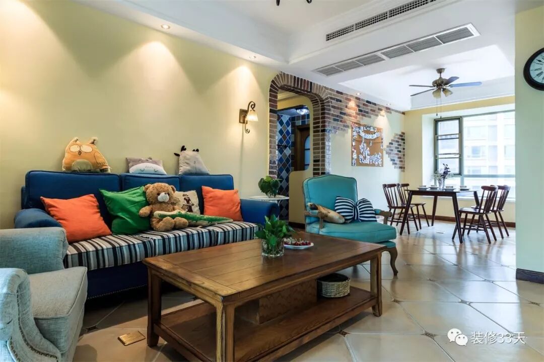 ▲ 客厅地面通铺仿石砖加角花,美式家具搭配暖黄色墙面,温馨休闲