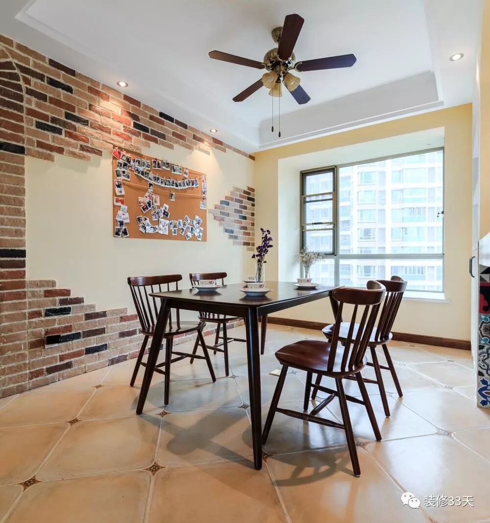 ▲ 餐厅地面与墙面延续客厅色调,红砖与浅黄色墙面,制造斑驳照片墙,一盏吊扇灯美观实用